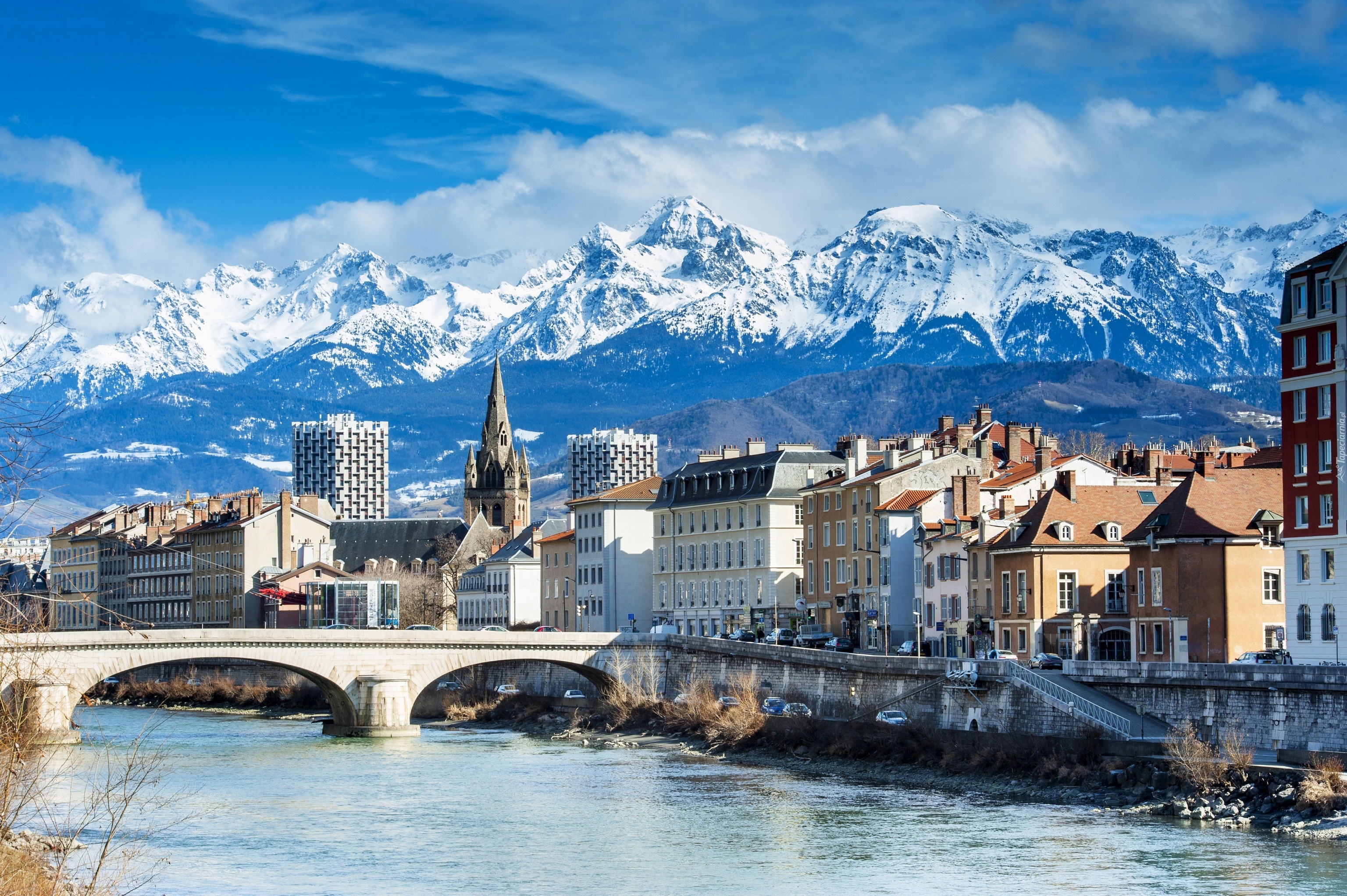 Edytor tapety: Miasto, Domy, Most, Rzeka, Góry