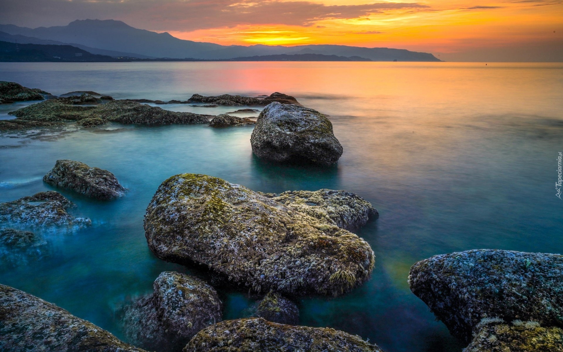 Edytor tapety: Zachód Słońca, Morze, Kamienie, Wybrzeże