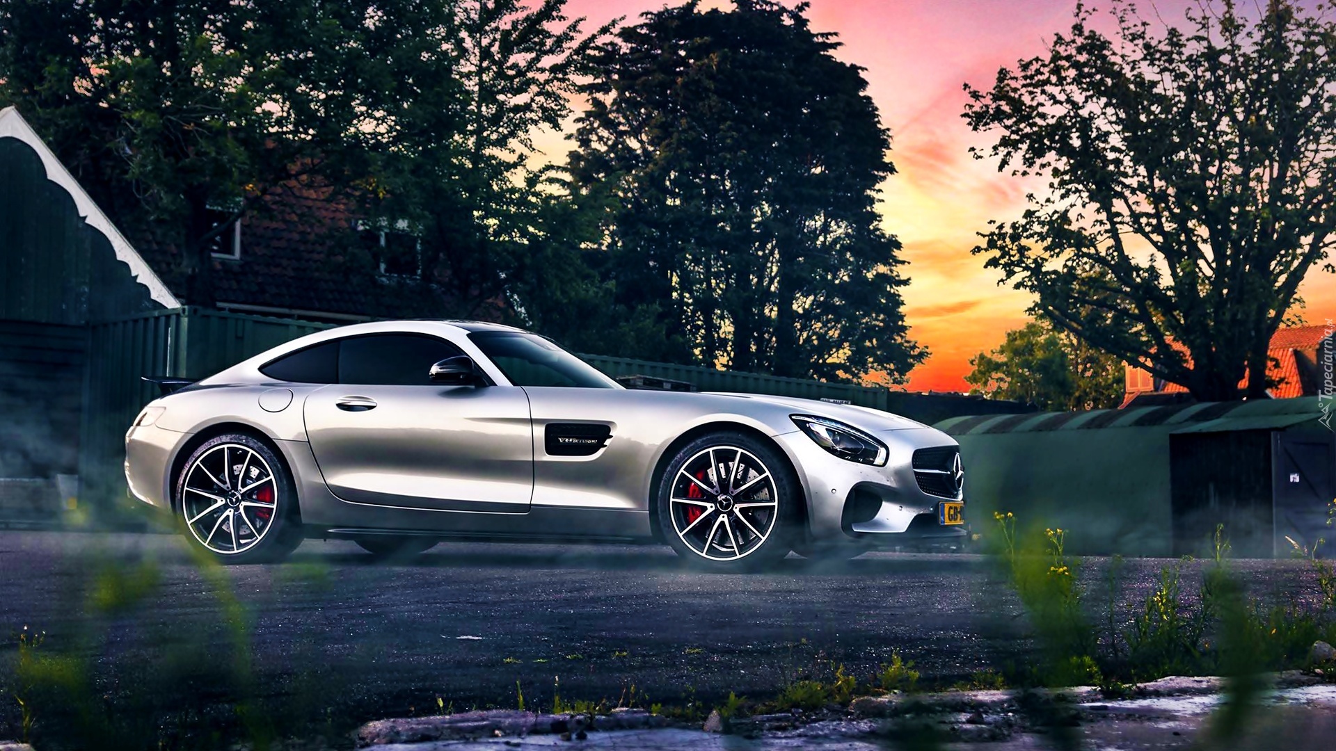 Edytor tapety: Mercedes, Banz, Zachód Słońca, Drzewa, Dom