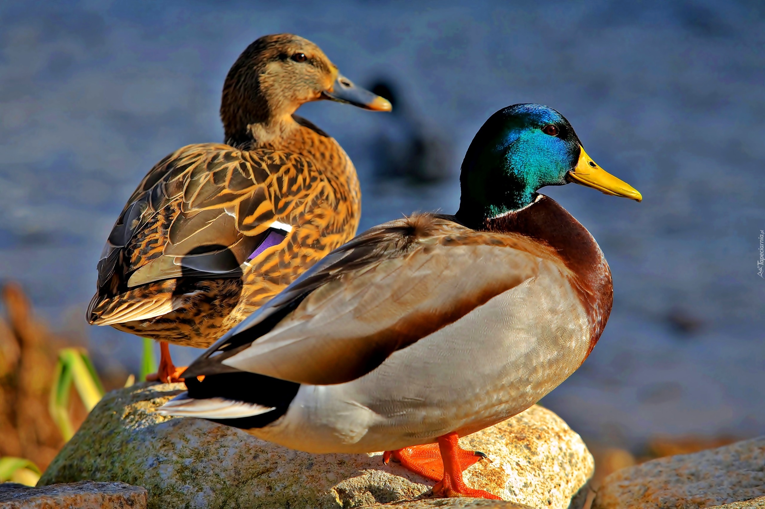 Edytor tapety: Kaczki, Krzyżówki, Para, Jezioro, Kamienie, Przebijające, Światło