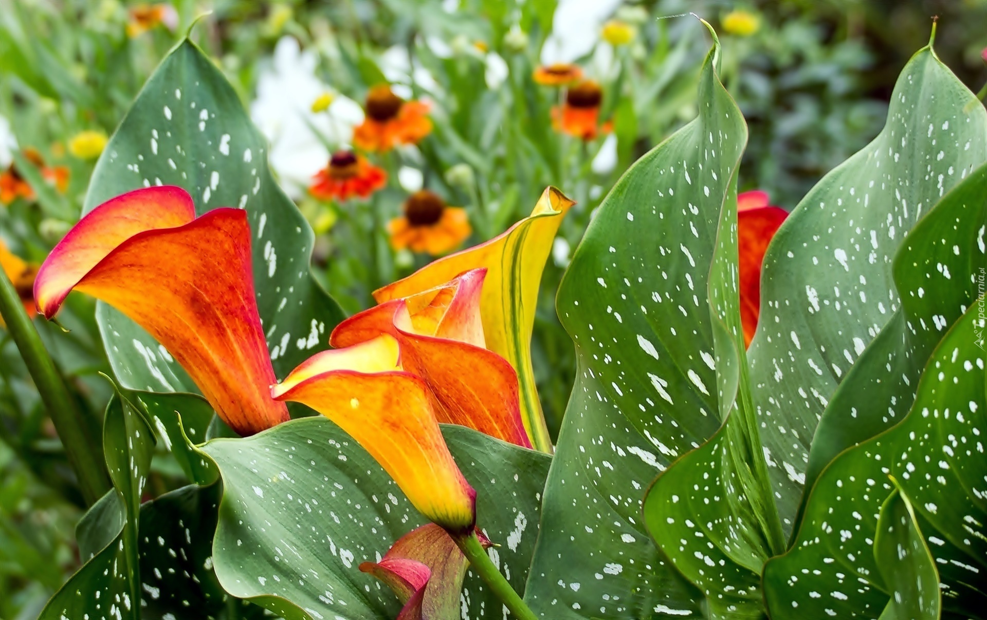 Edytor tapety: Pomarańczowe, Kalie, Liście, Ogród