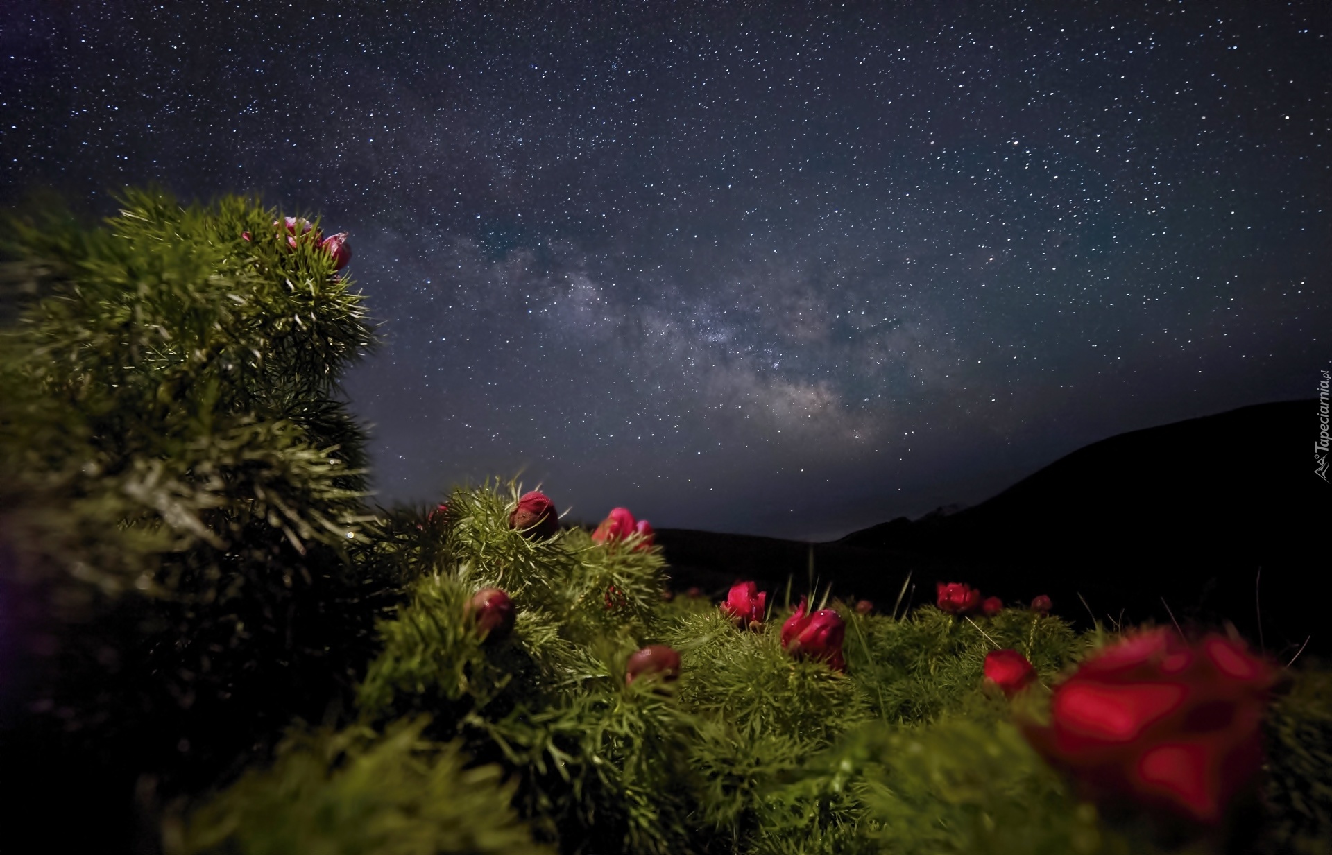 Edytor tapety: Niebo, Noc, Gwiazdy, Iglaki, Czerwone, Kwiaty