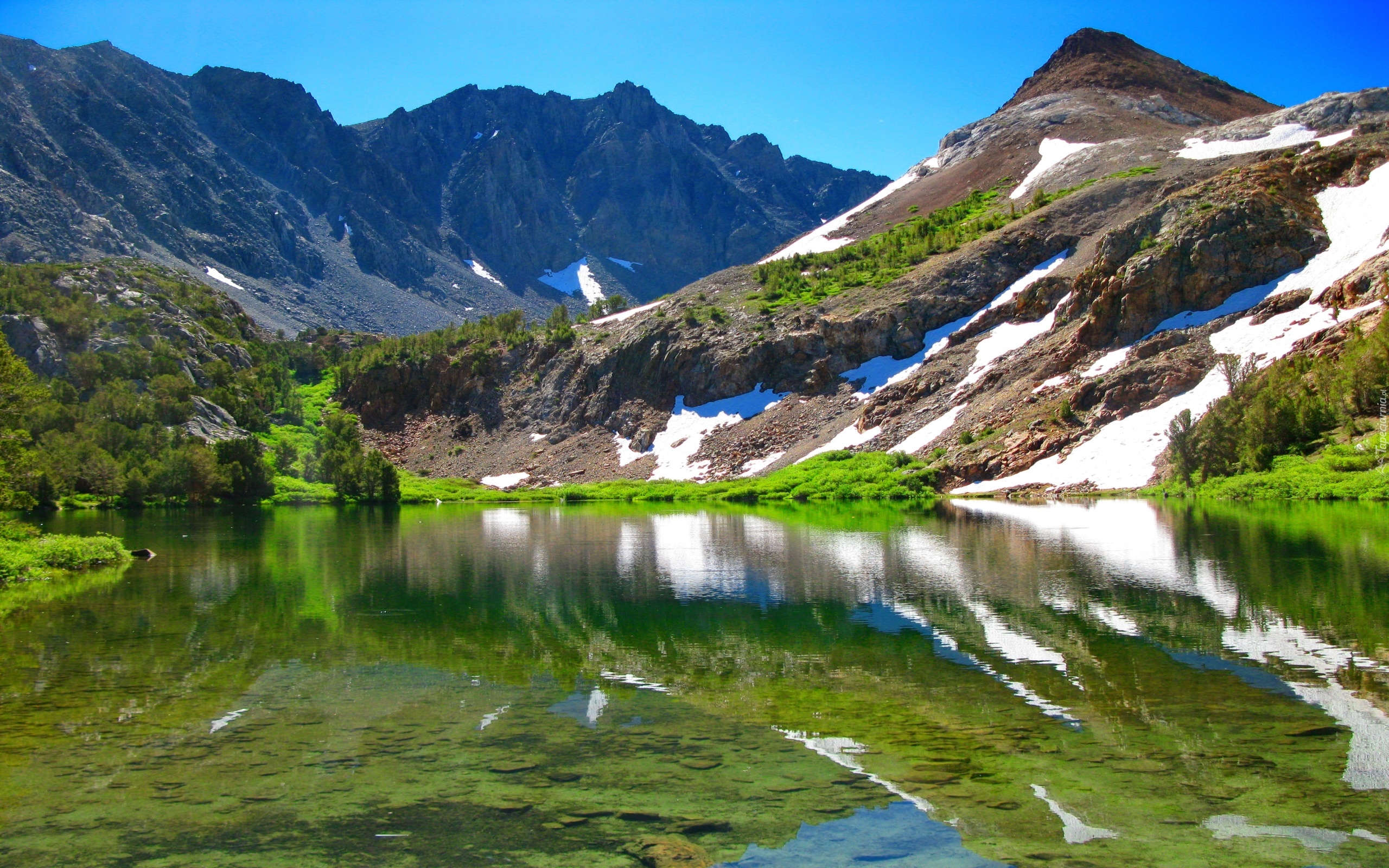 Edytor tapety: Góry, Jezioro, Śnieg, Odbicie, Rośliny