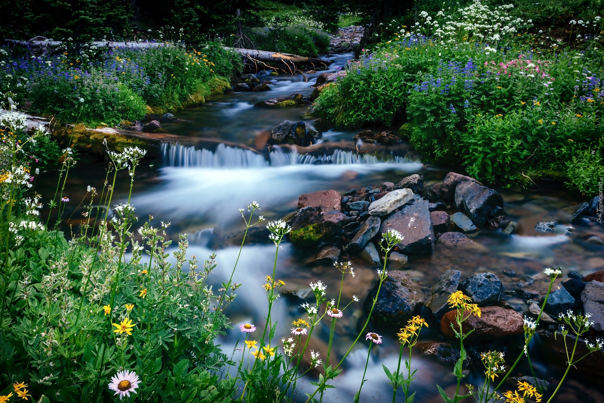 Edytor tapety: Potok, Kwiaty, Kamienie
