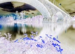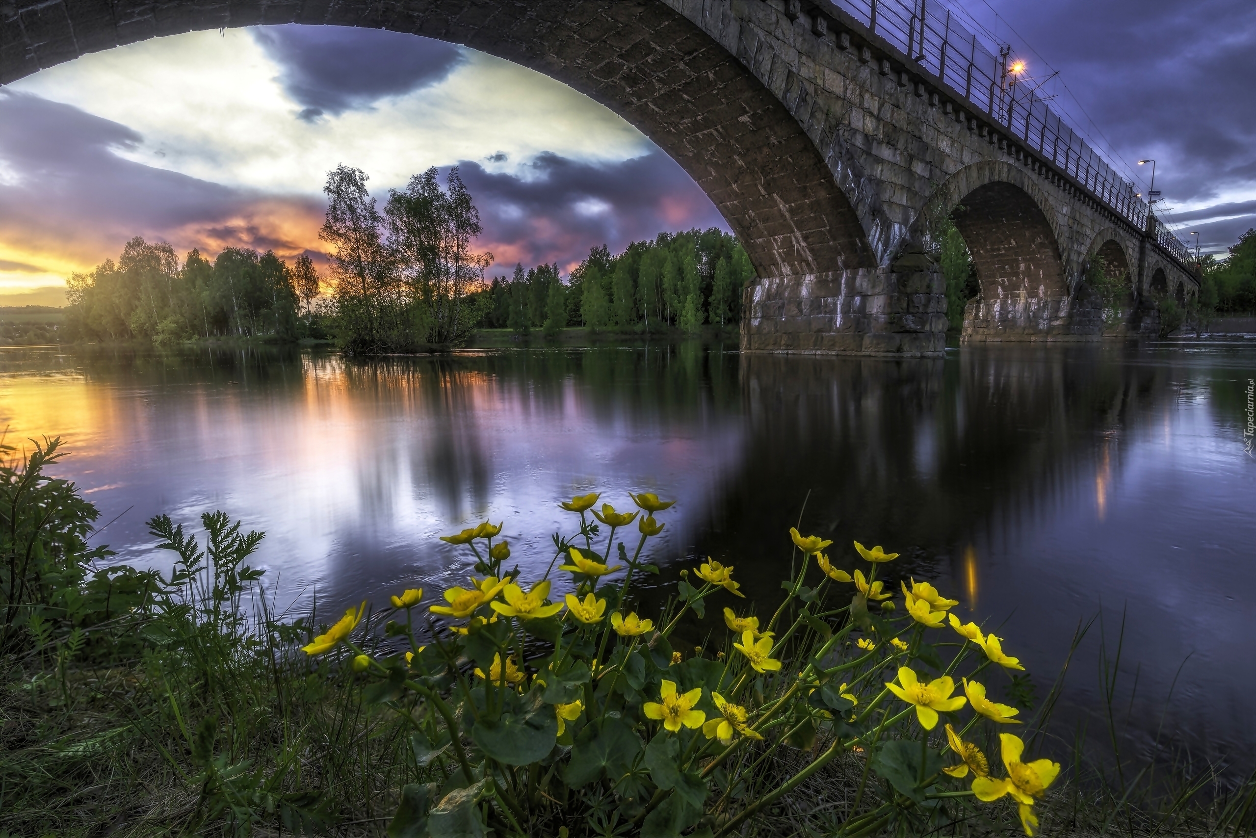 Edytor tapety: Most, Rzeka, Zachód Słońca, Kwiaty, Drzewa
