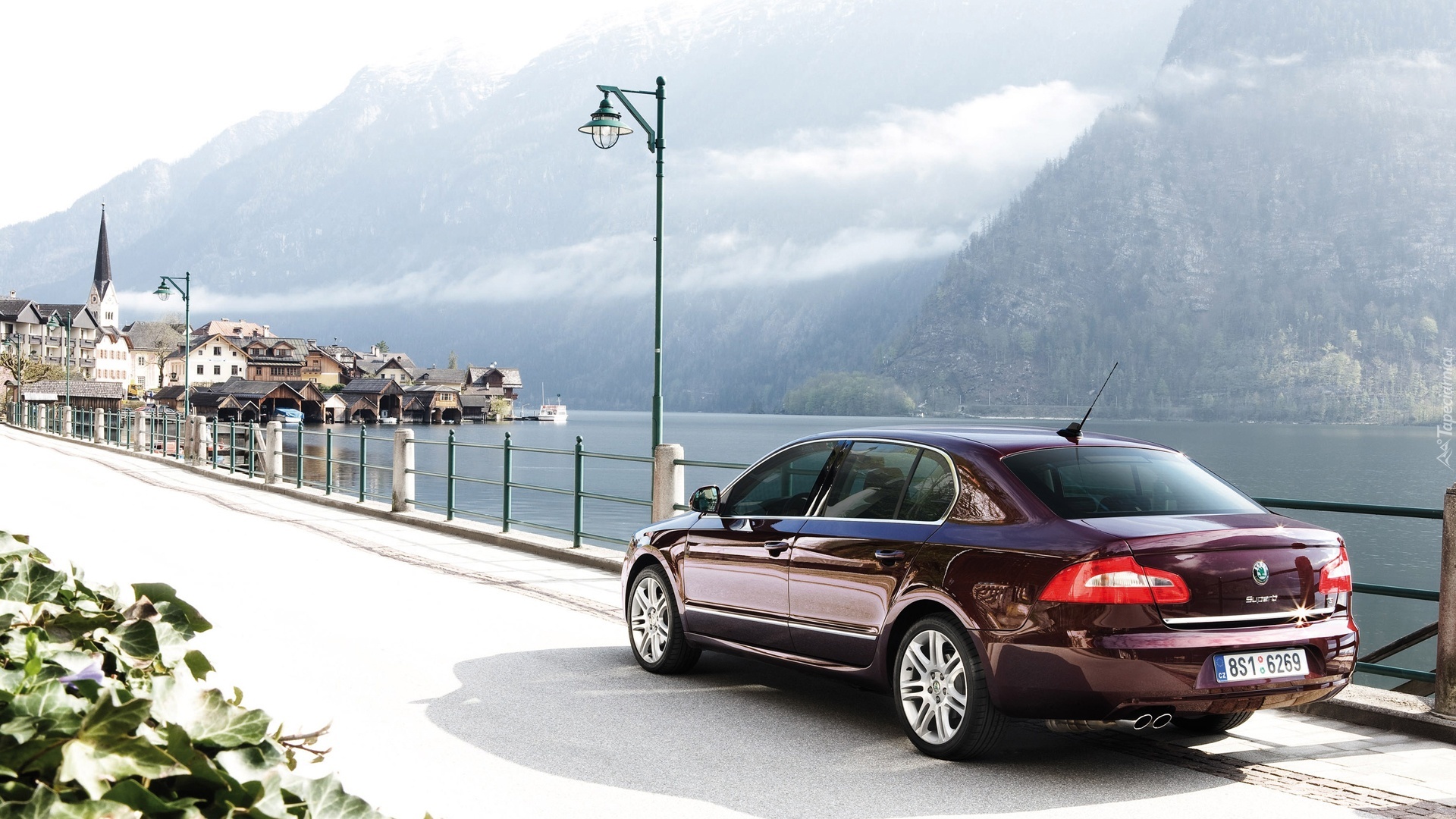 Edytor tapety: Brązowa, Skoda, Droga, Miasteczko, Góry, Rzeka