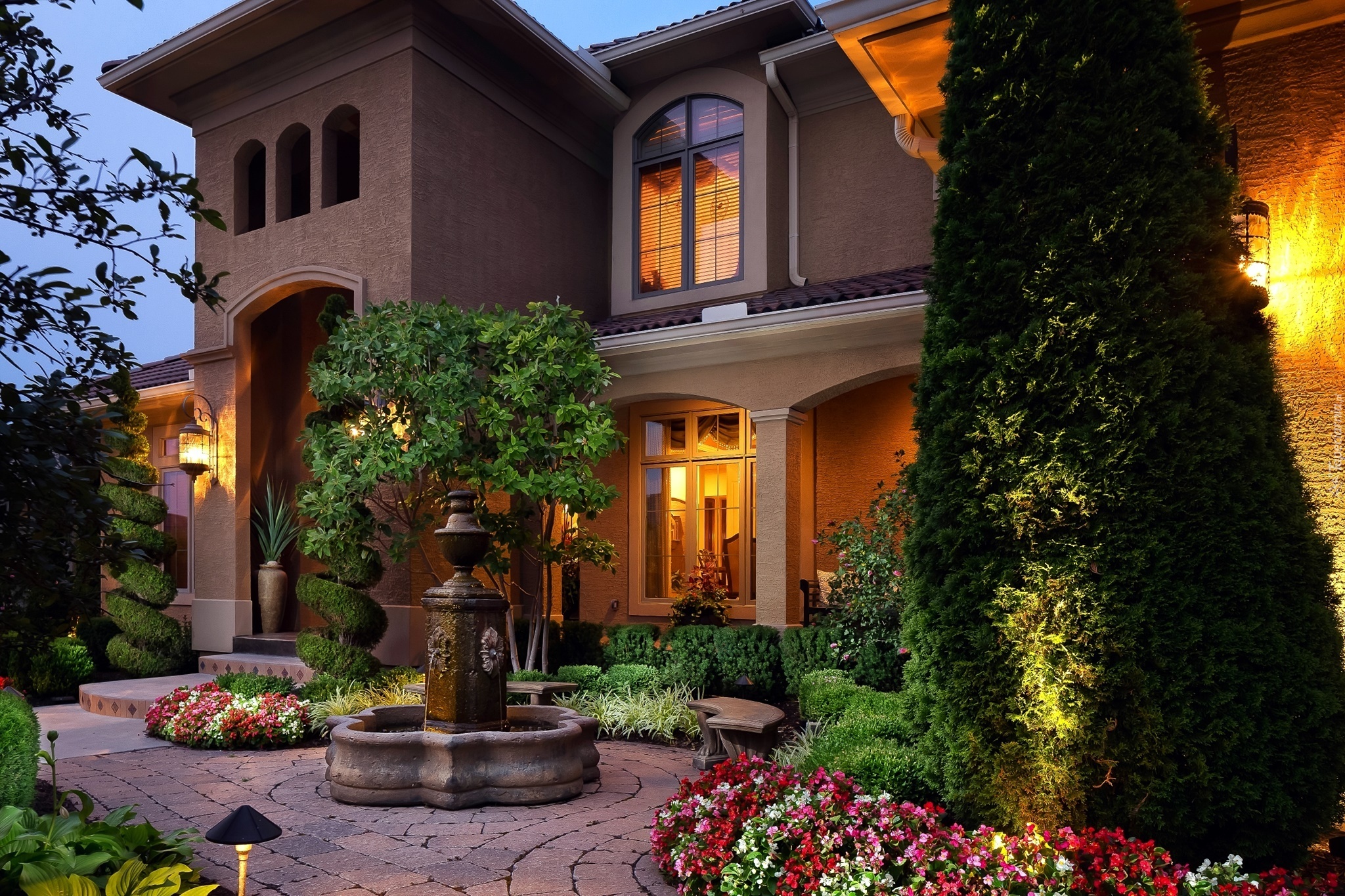 Edytor tapety: Oświetlony, Dom, Ogród, Fontanna