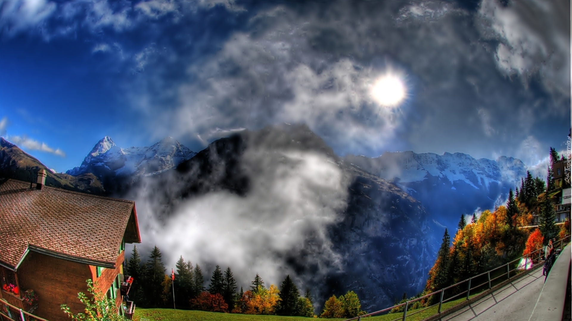 Edytor tapety: Góry, Alpy, Chmury, Las, Droga, Dom