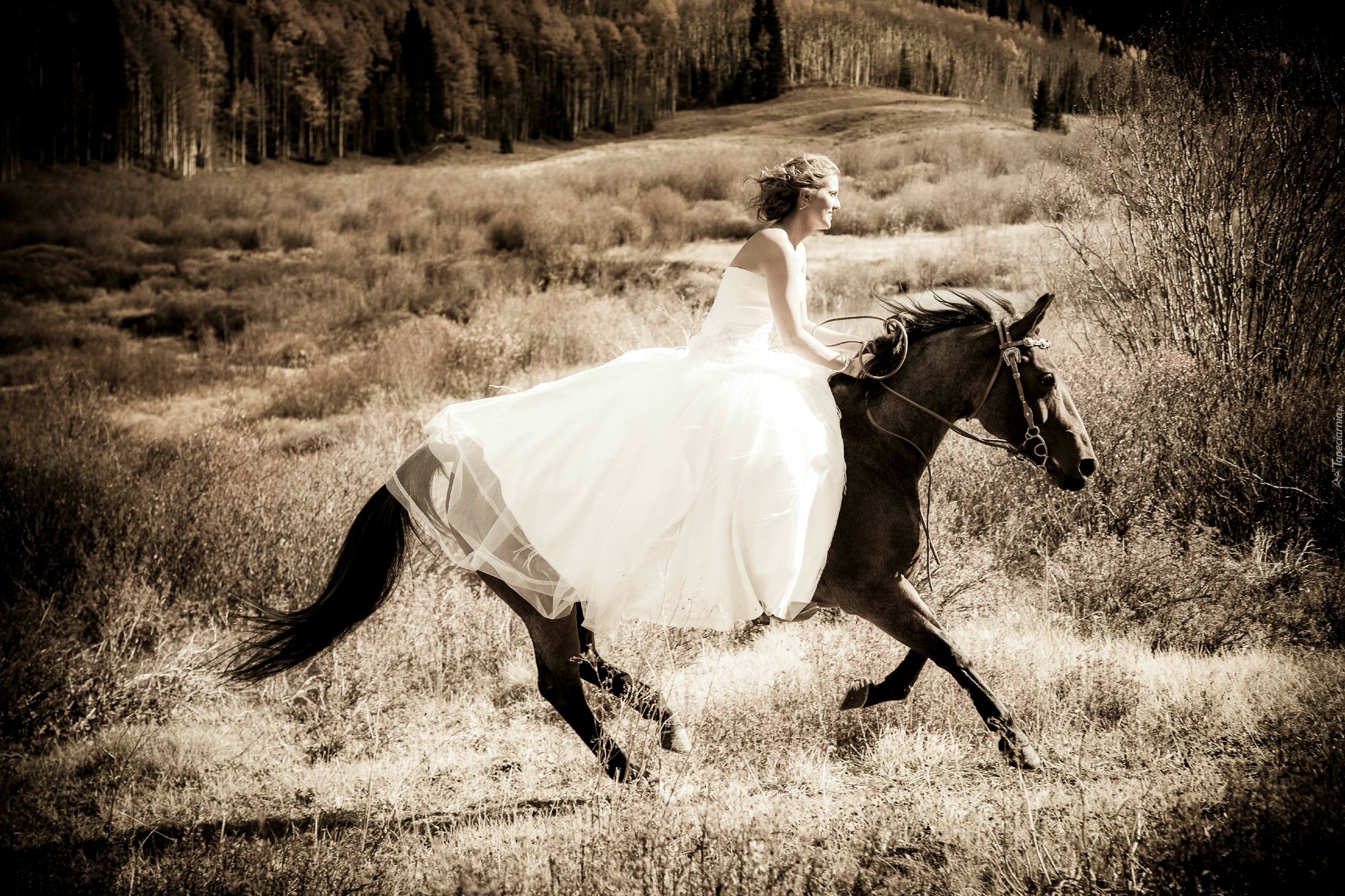 Edytor tapety: Kobieta, Suknia Ślubna, Koń, Galop, Preria