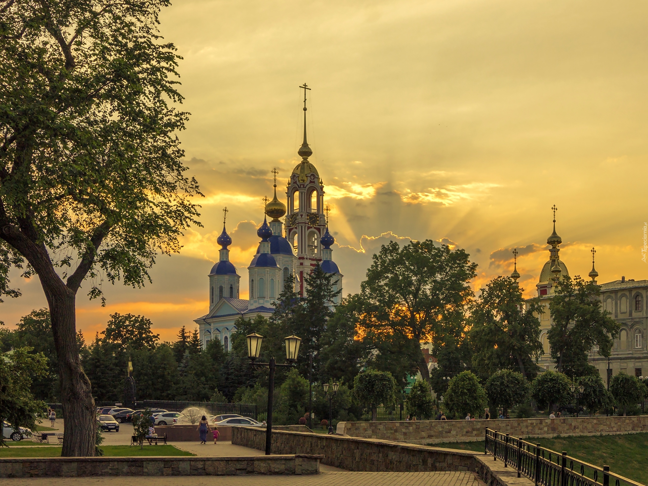 Edytor tapety: Cerkiew, Zachód, Słońca, Drzewa, Alejki