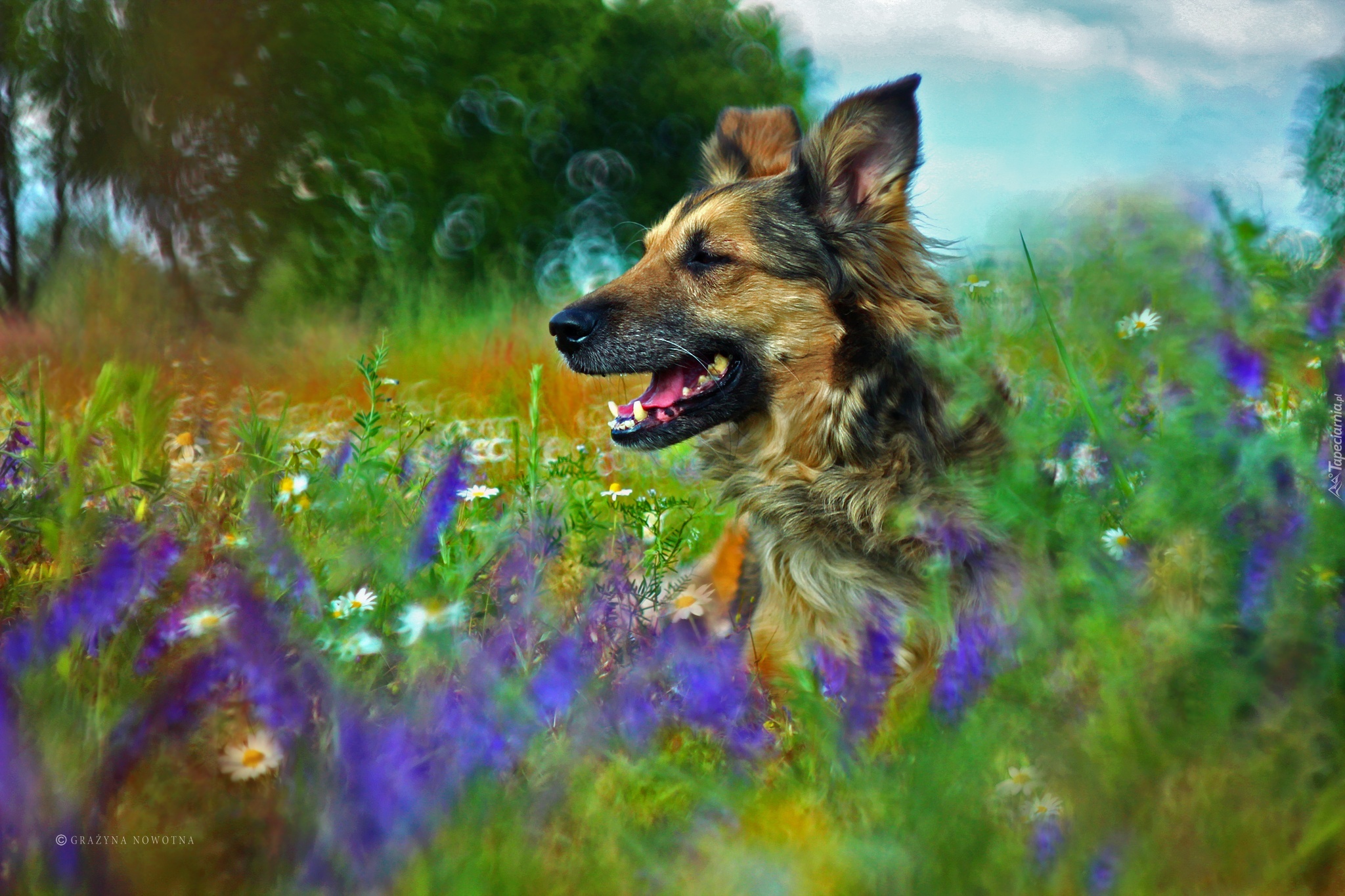 Edytor tapety: Pies, Shila, Łąka, Kolorowe, Kwiaty, Kundelek