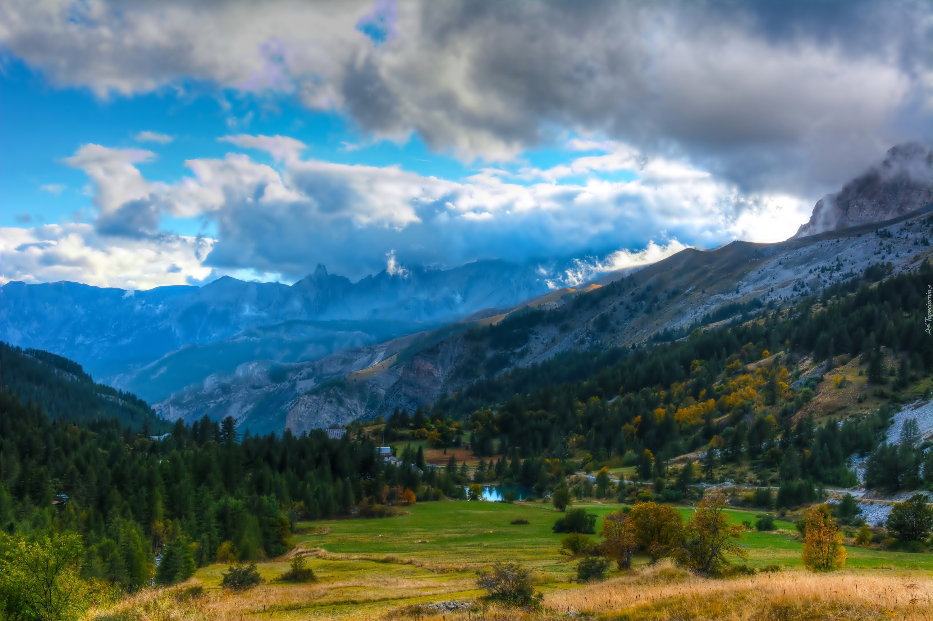 Edytor tapety: Góry, Chmury, Lasy, Łąka, Dolina