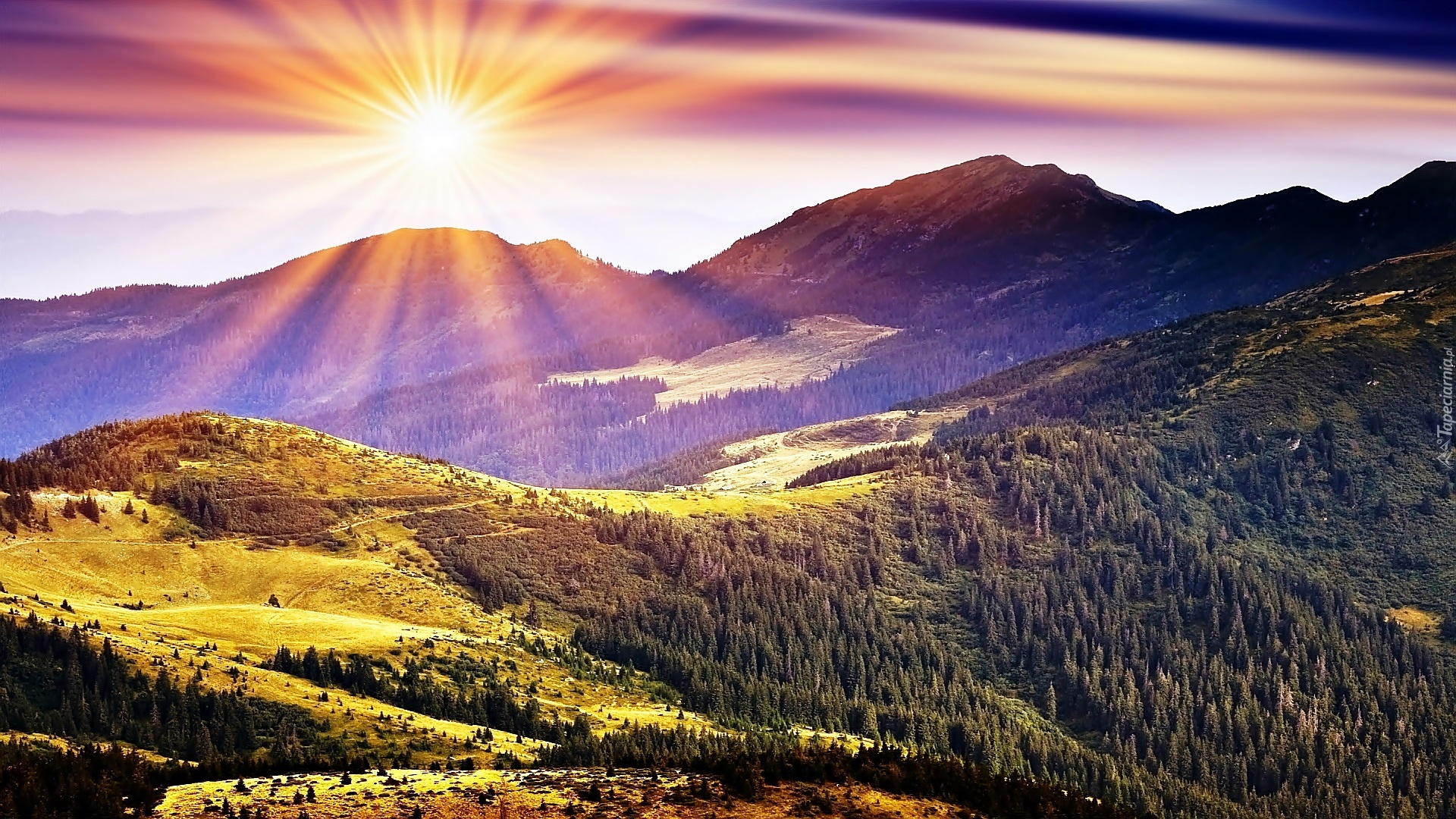 Edytor tapety: Góry, Lasy, Łąki, Promienie, Słońca