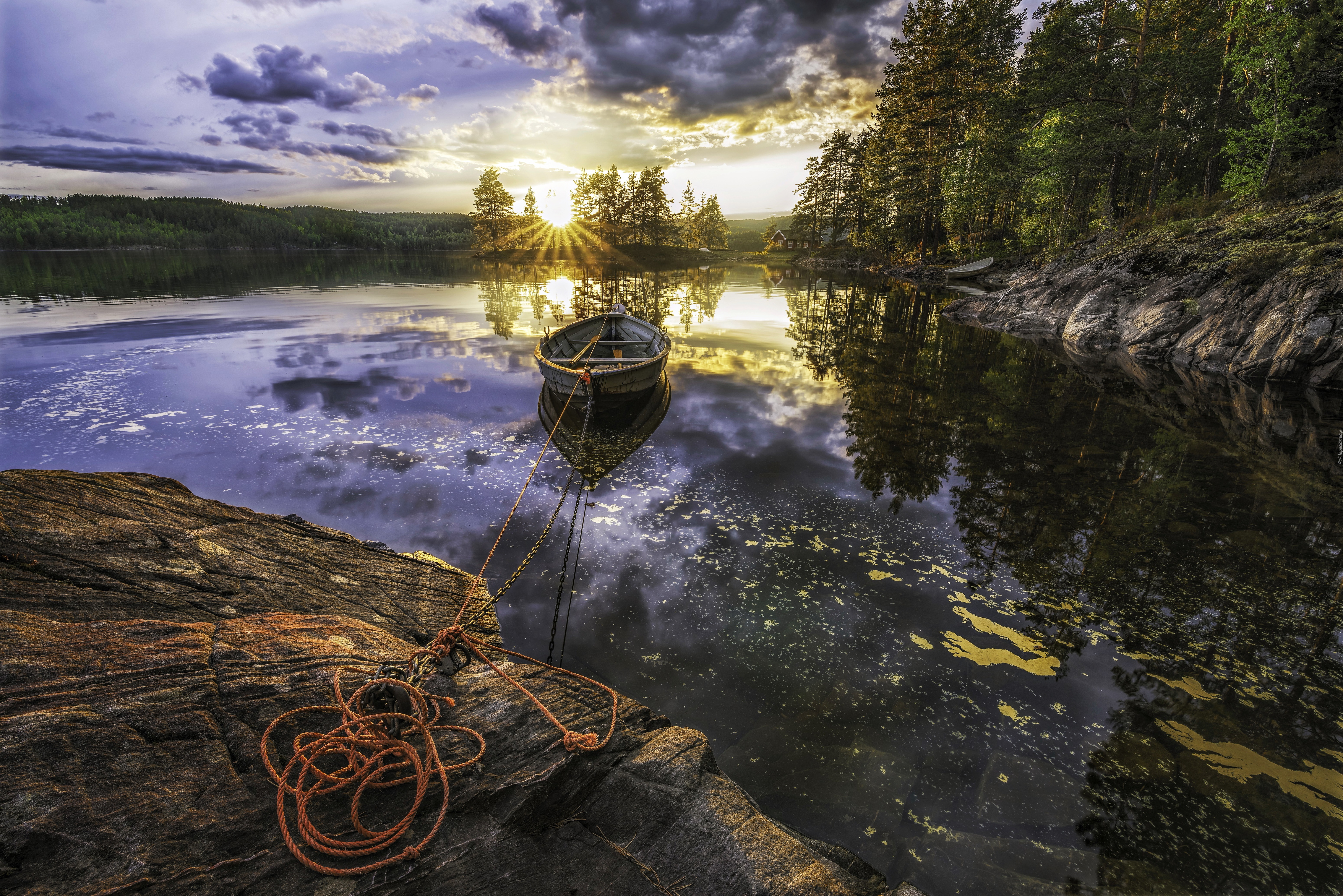 Edytor tapety: Jezioro, Wschód Słońca, Łódka