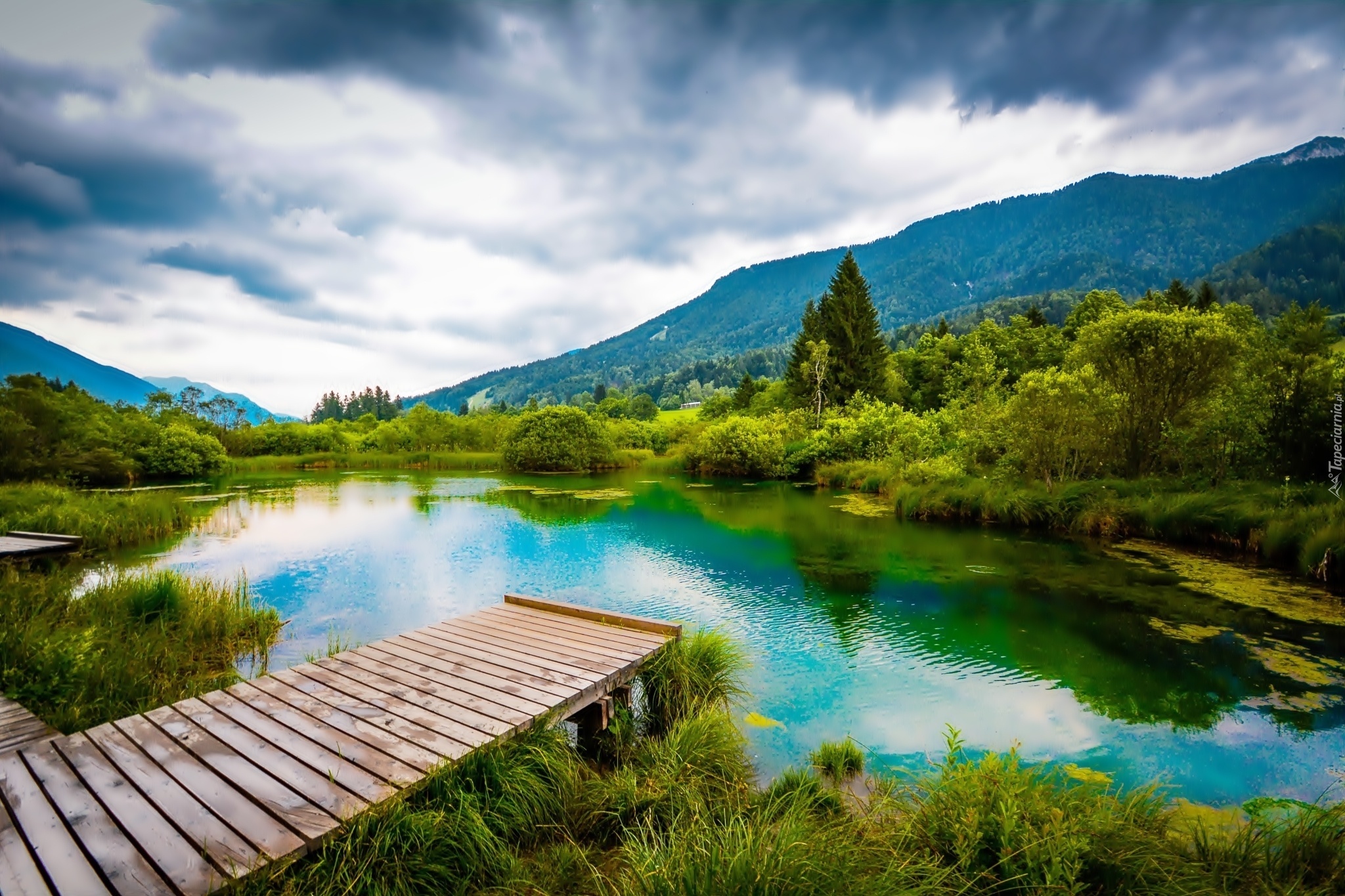 Edytor tapety: Góry, Las, Jezioro, Pomost