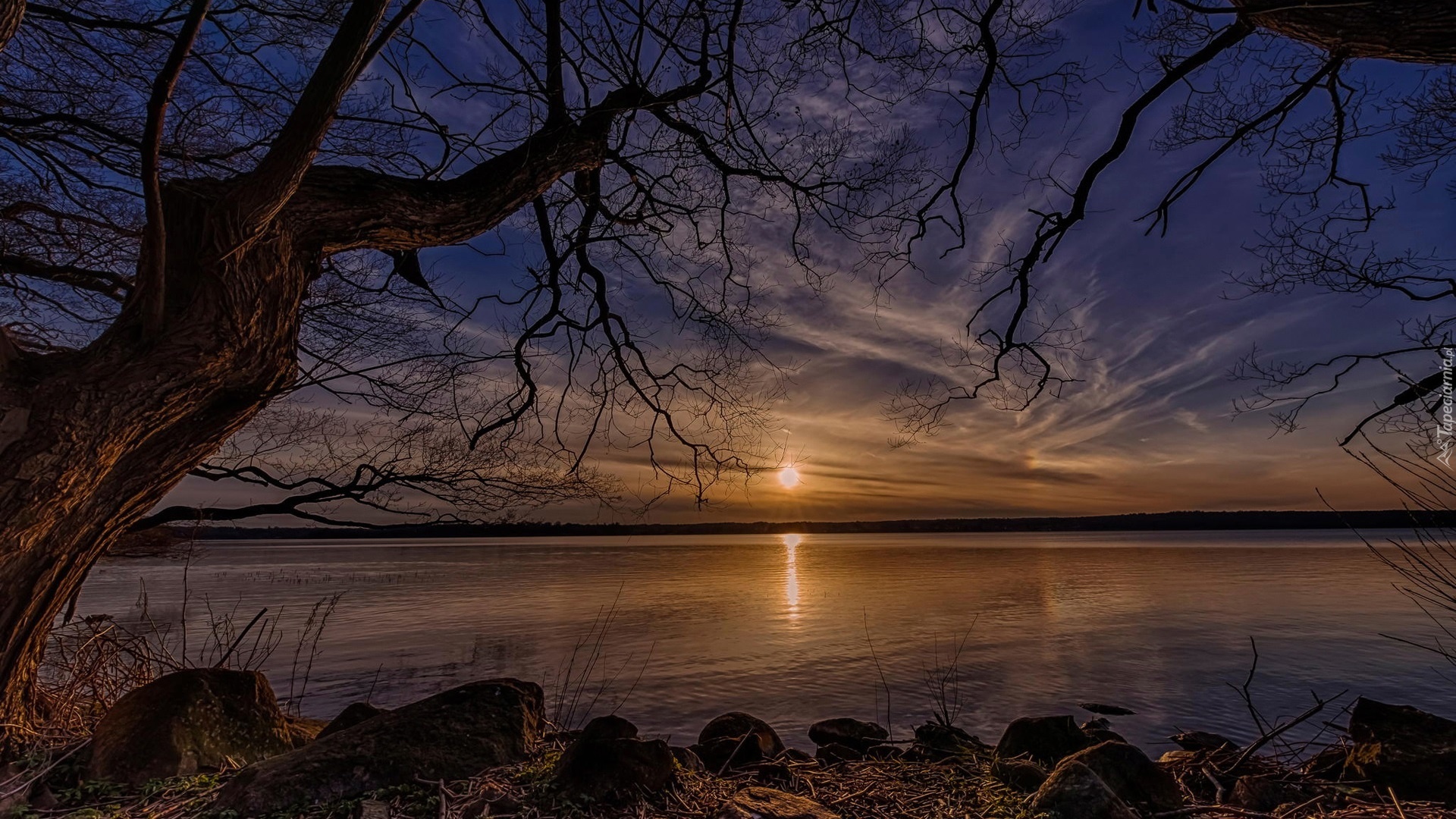Edytor tapety: Zachód, Słońca, Drzewo, Kamienie, Jezioro