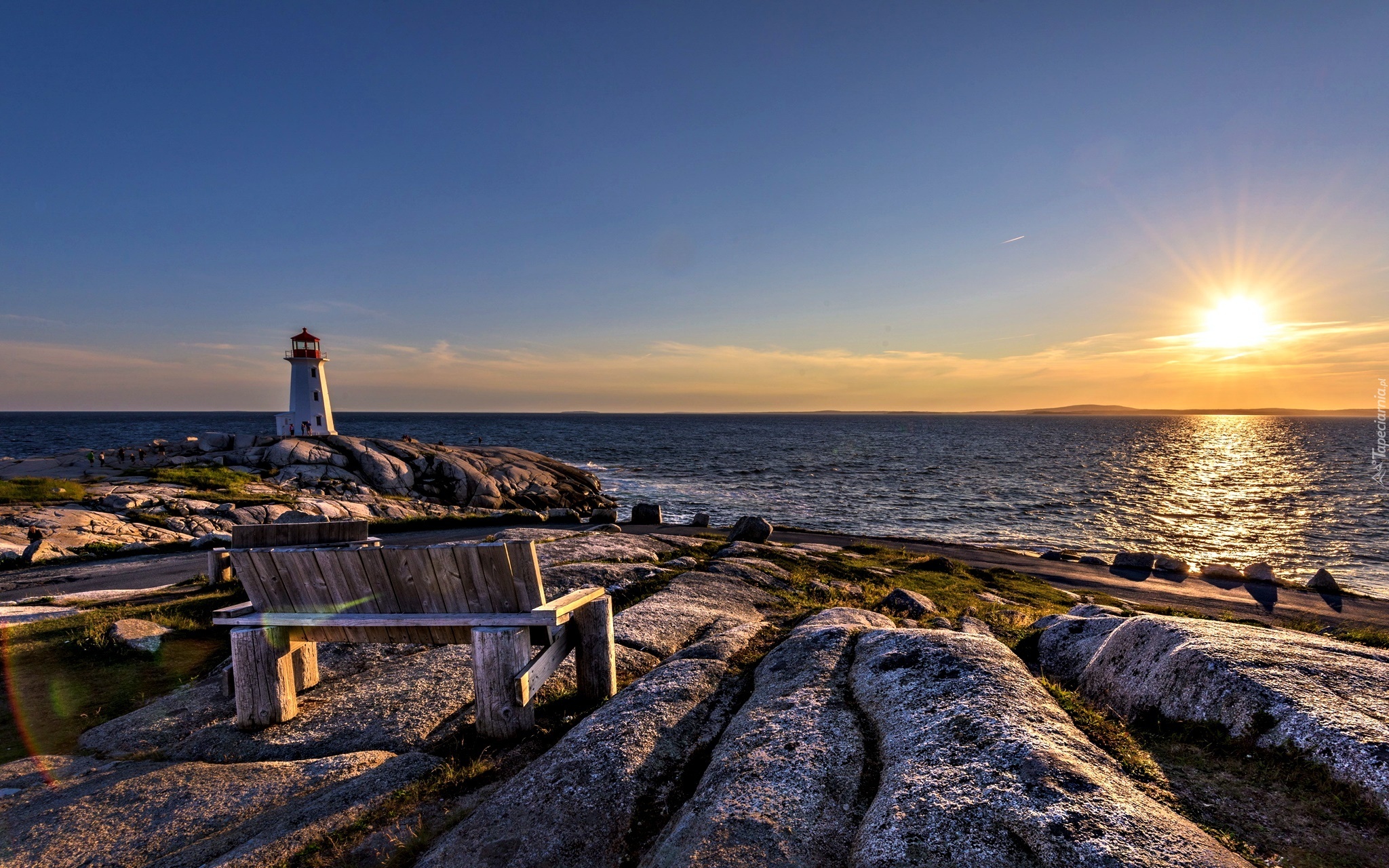 Edytor tapety: Zachód Słońca, Morze, Skałki, Ławka, Latarnia Morska