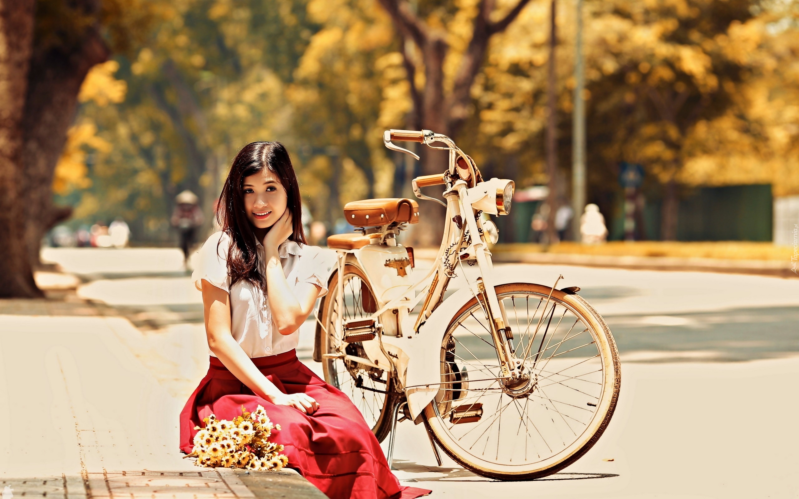 Edytor tapety: Dziewczyna, Azjatka, Bukiet, Rower, Ulica
