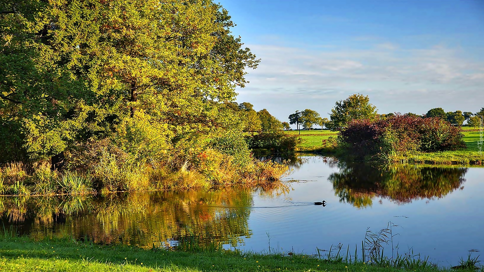 Edytor tapety: Drzewa, Łąka, Jezioro, Kaczka, Przebijające, Światło, Odbicie