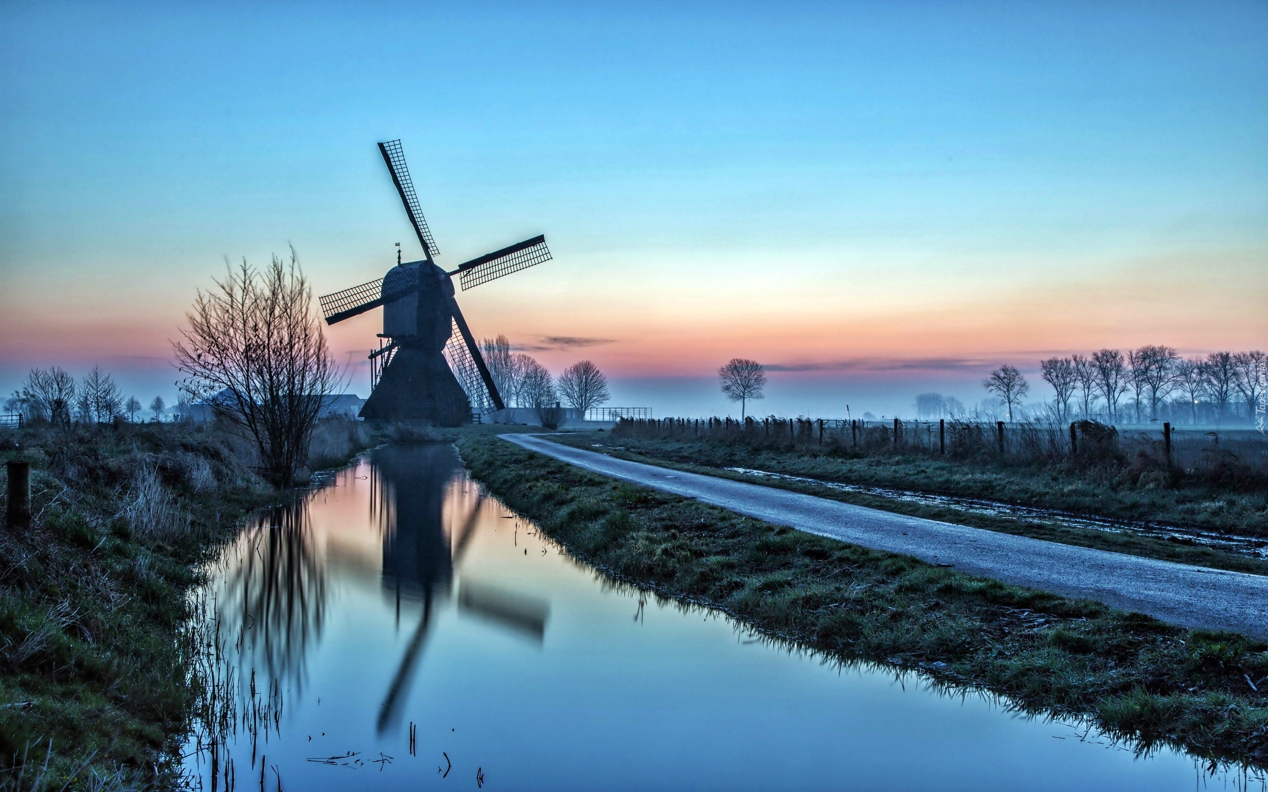 Edytor tapety: Pola, Rzeka, Mgła, Wiatrak, Świt