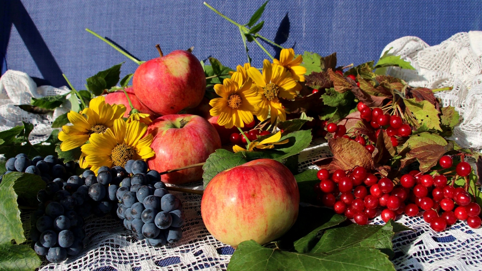 Edytor tapety: Jesienne, Zbiory, Owoce, Jabłka, Winogrona, Kwiaty