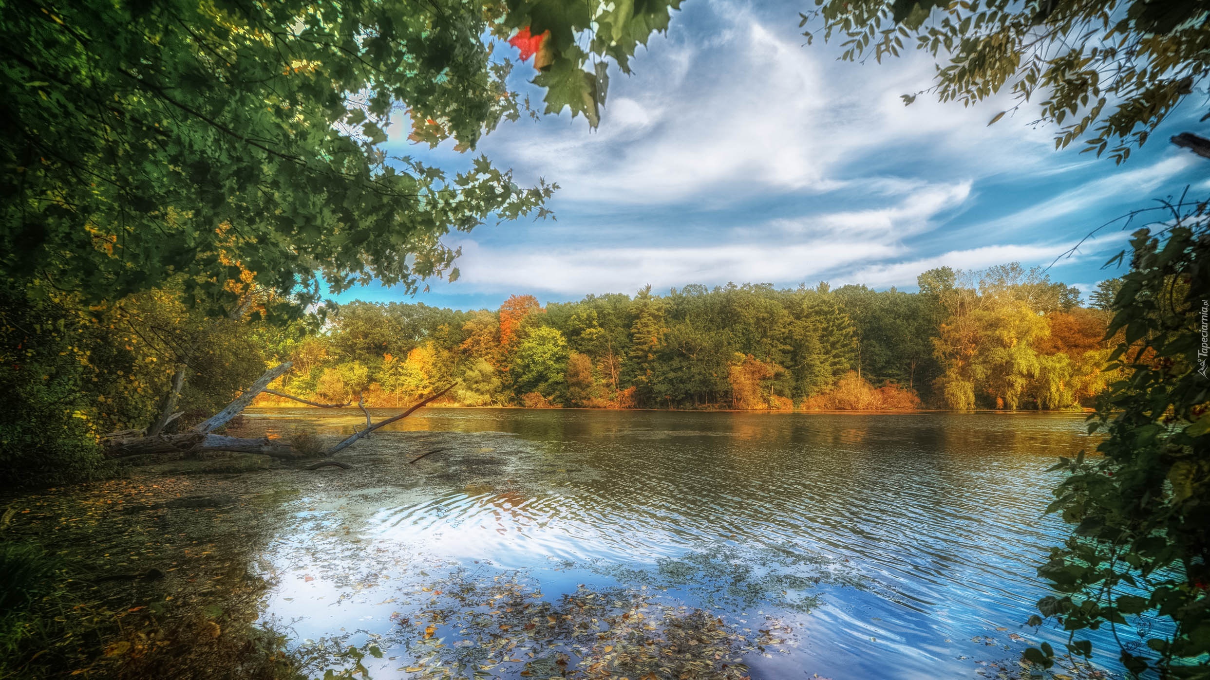 Edytor tapety: Jezioro, Las, Drzewa, Niebo, Chmury