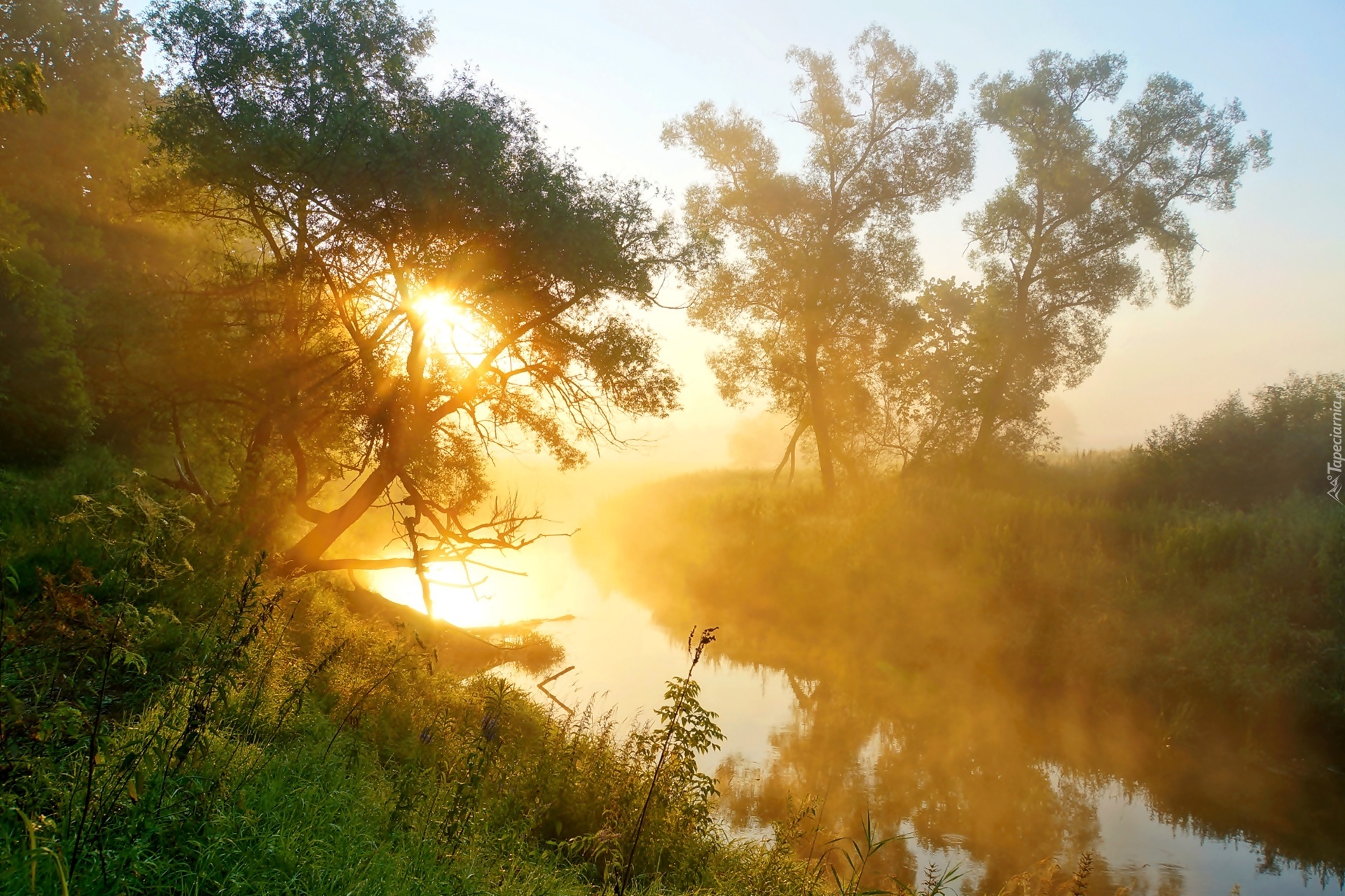 Edytor tapety: Rzeka, Mgła, Promienie, Słońca, Drzewa