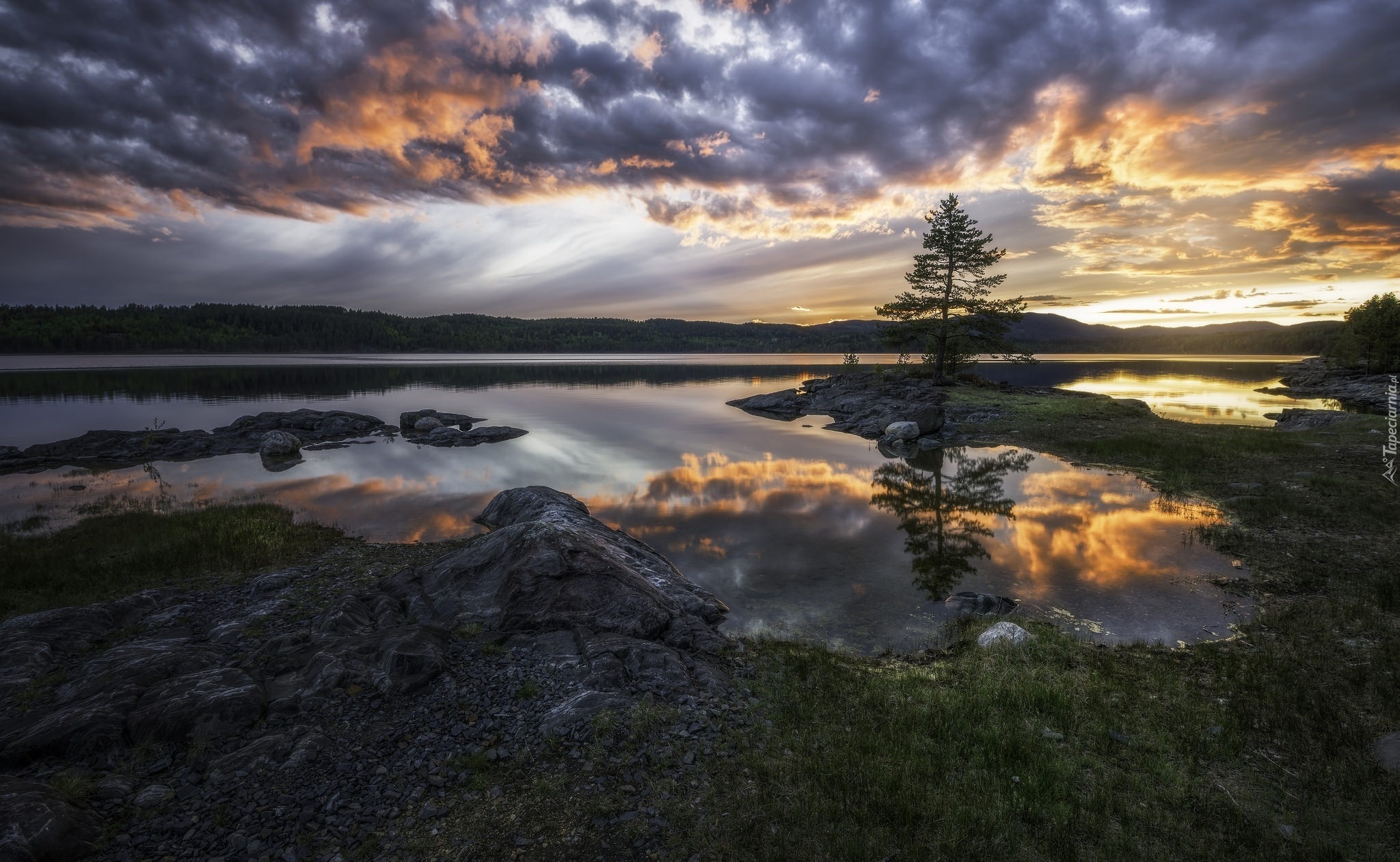 Edytor tapety: Norwegia, Jezioro, Drzewo, Niebo, Chmury, Odbicie