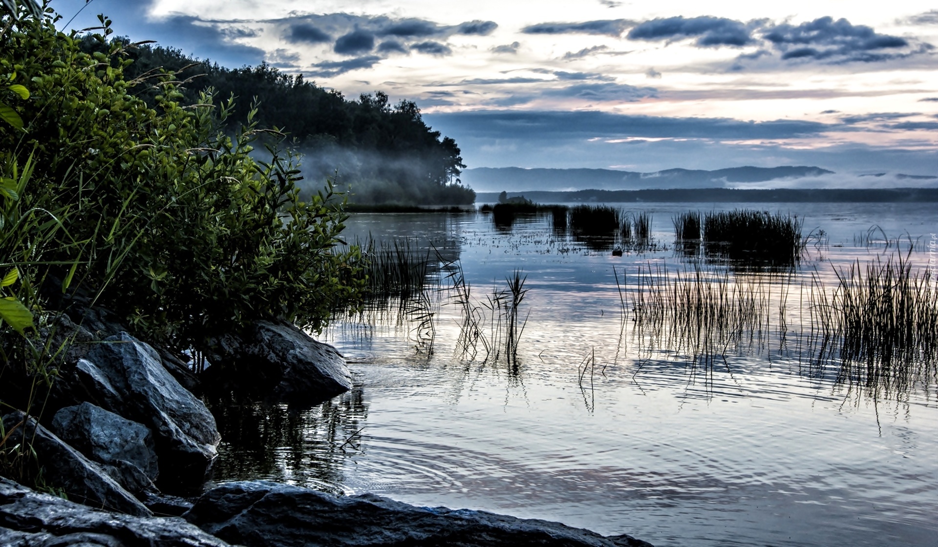 Edytor tapety: Jezioro, Mgła, Kamienie, Rosliny