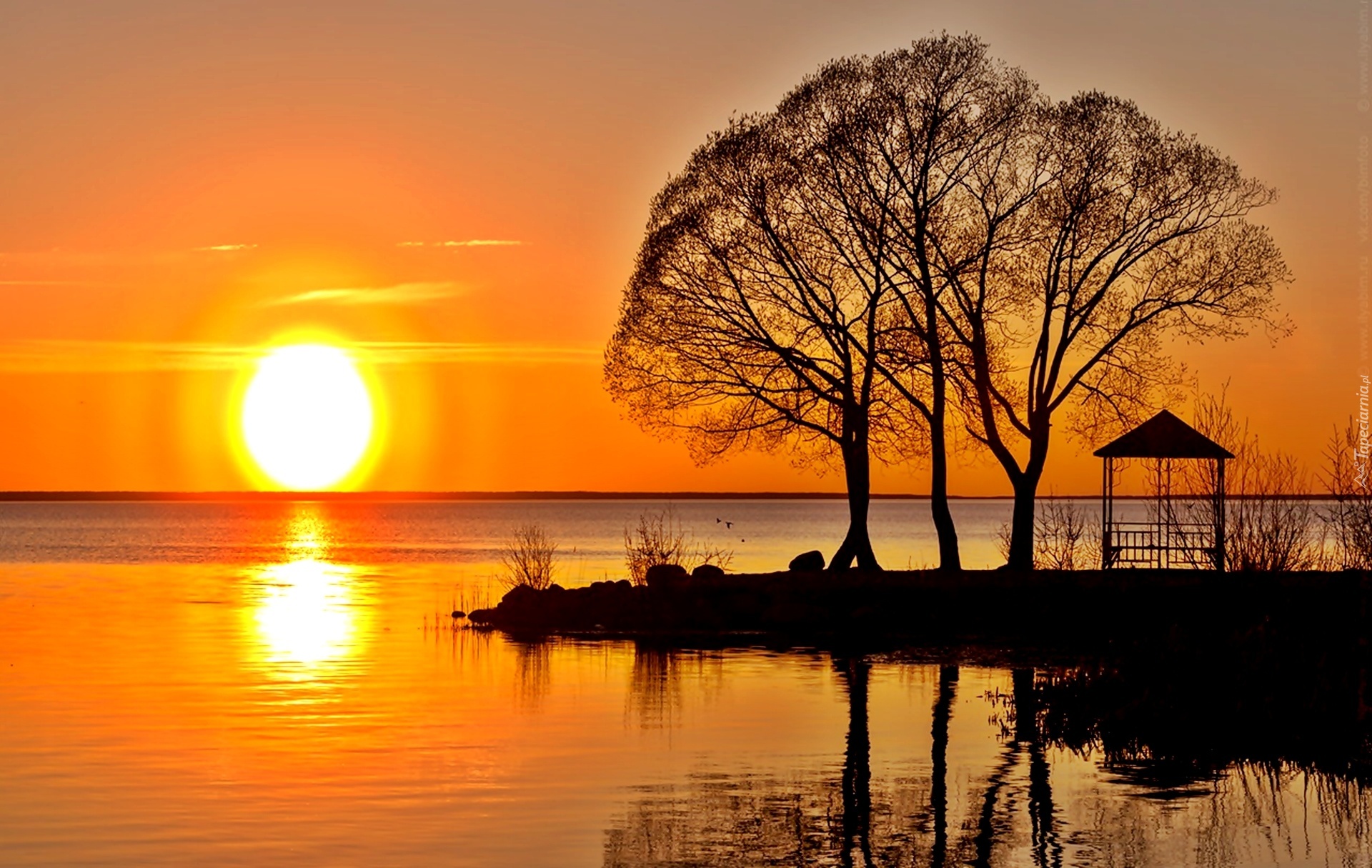 Edytor tapety: Jezioro, Zachód, Słońca, Drzewa, Altanka