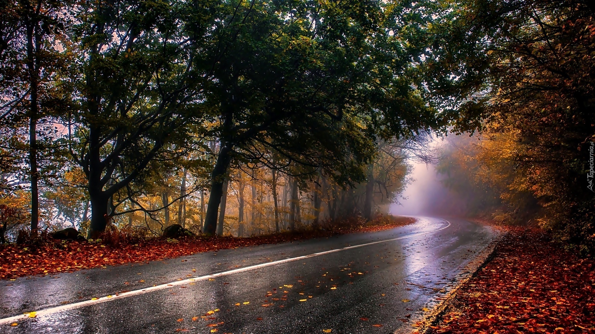 Edytor tapety: Jesień, Droga, Las, Liście, Mgła