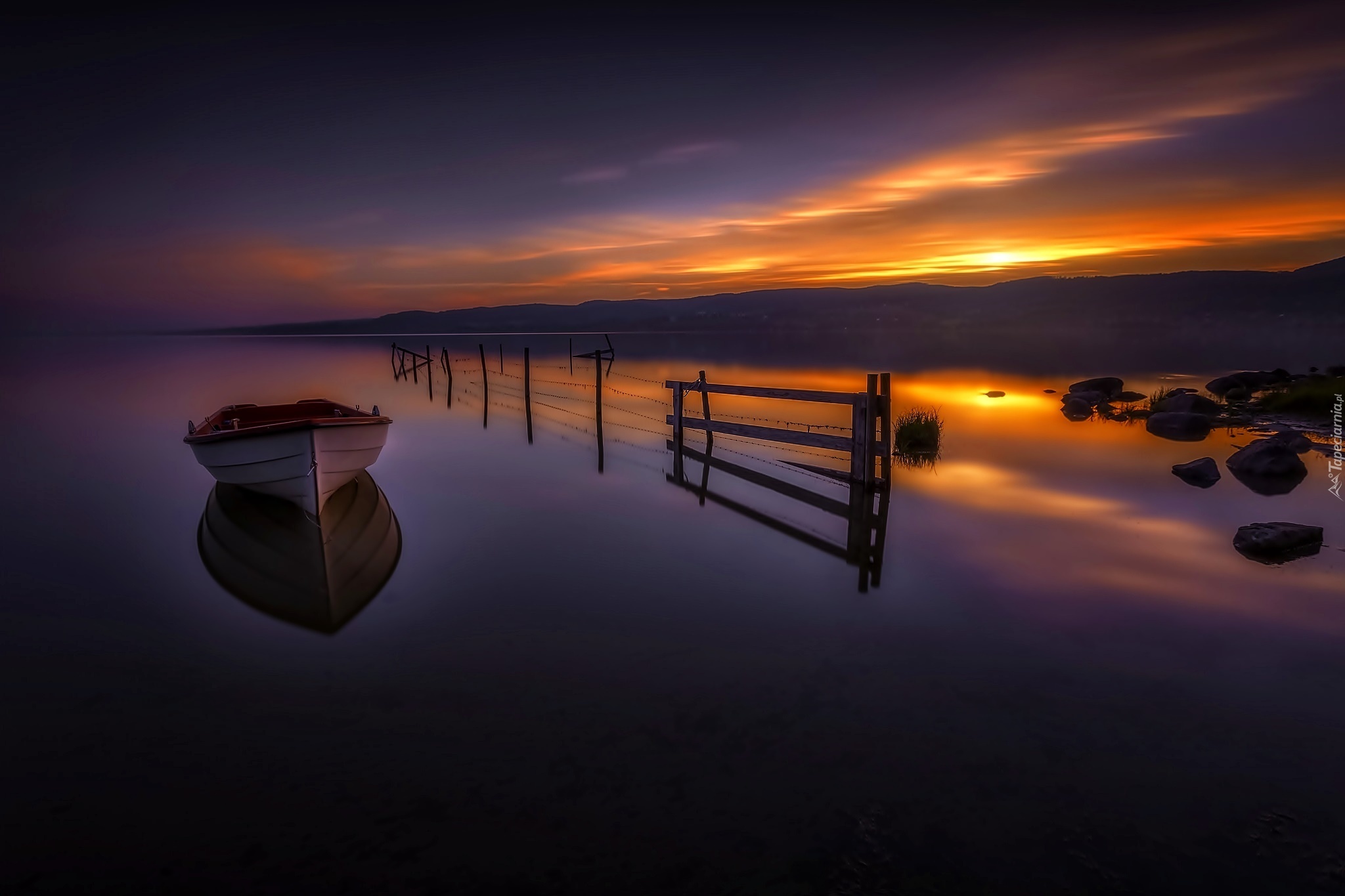 Edytor tapety: Jezioro Tyrifjorden, Norwegia, Zachód Słońca, Łódź, Odbicie