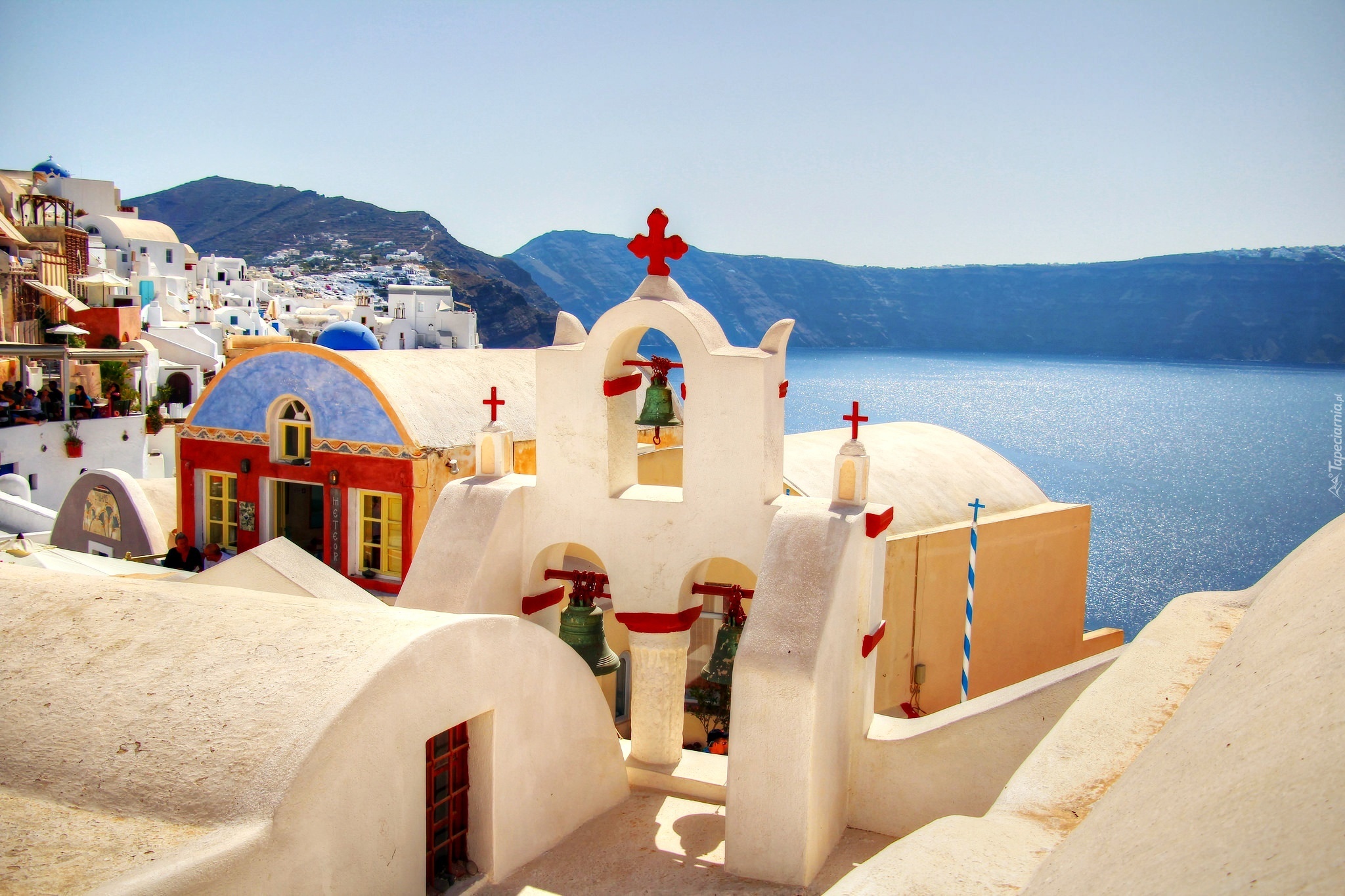 Edytor tapety: Grecja, Santorini, Morze, Góry, Kościoły