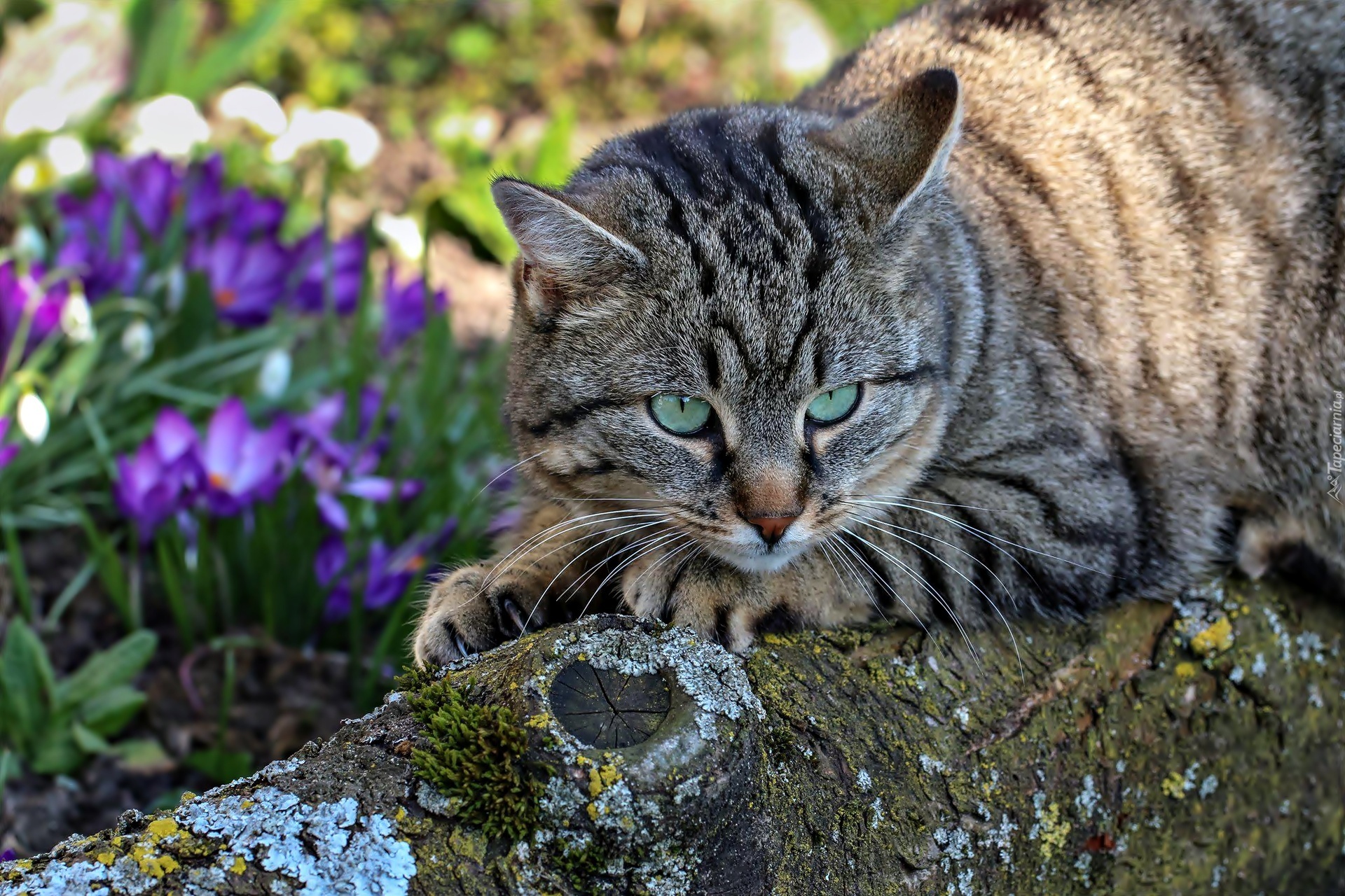 Edytor tapety: Kot, Kwiaty, Krokusy, Drzewo