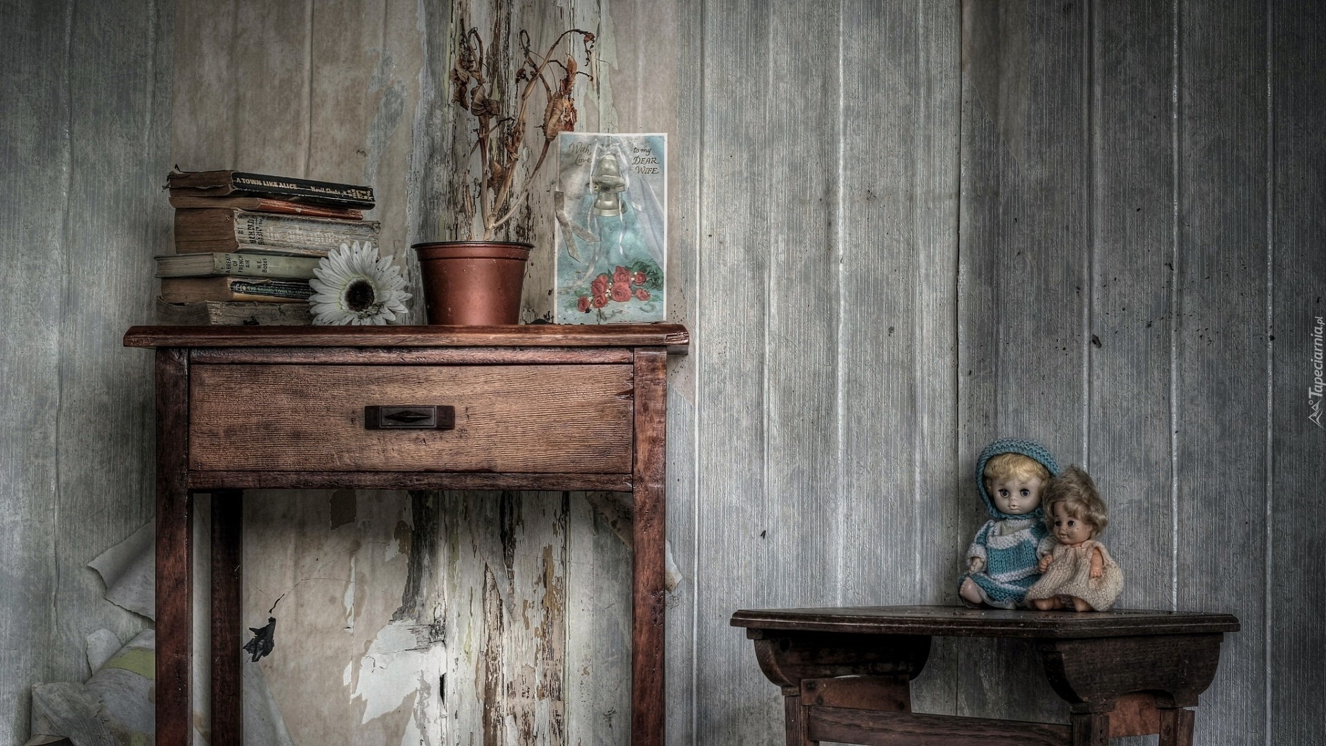 Edytor tapety: Zaniedbane, Wnętrze, Mebel, Książki, Lalki