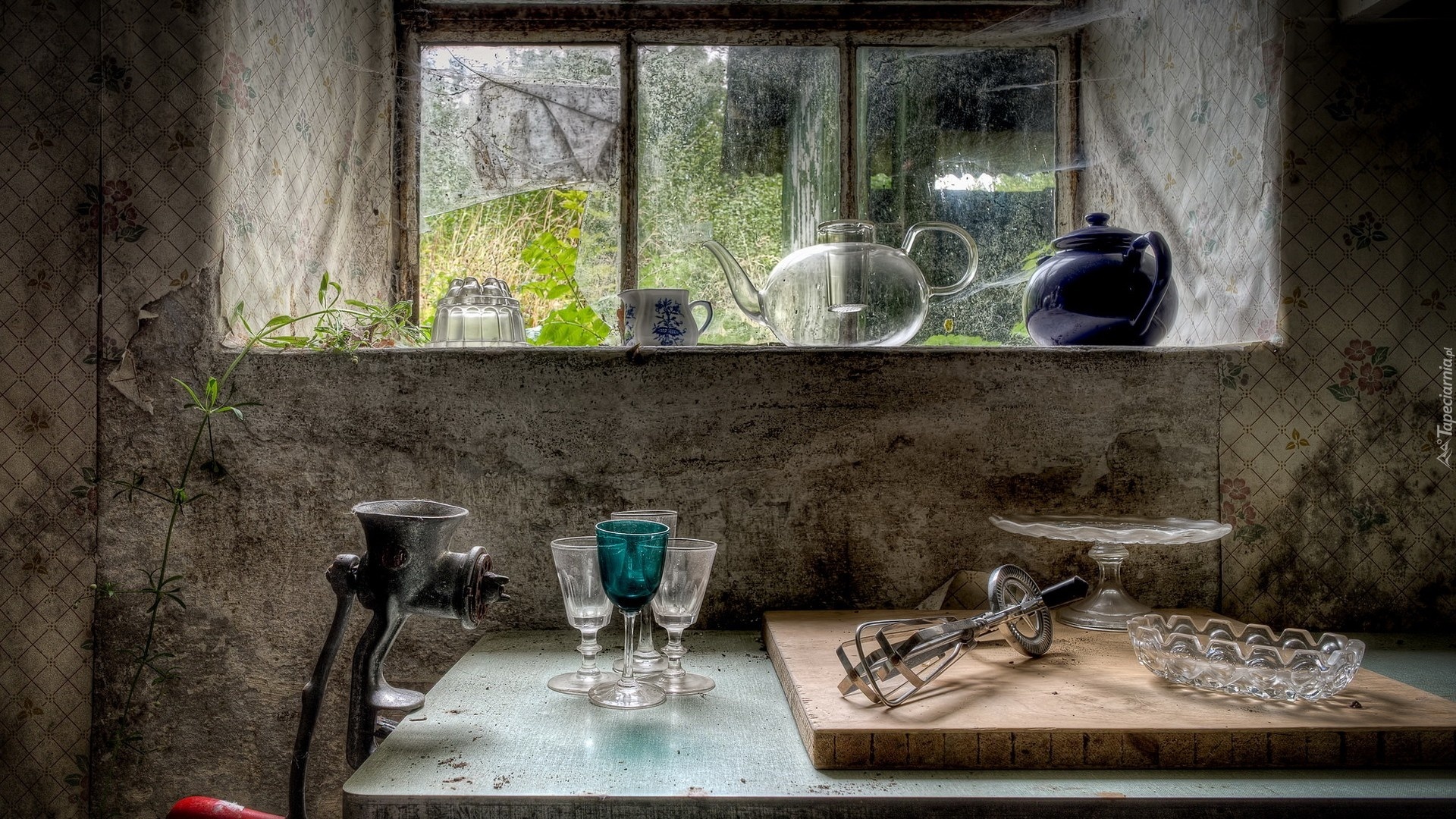 Edytor tapety: Zaniedbane, Wnętrze, Okno, Kieliszki, Maszynka, Dzbanki