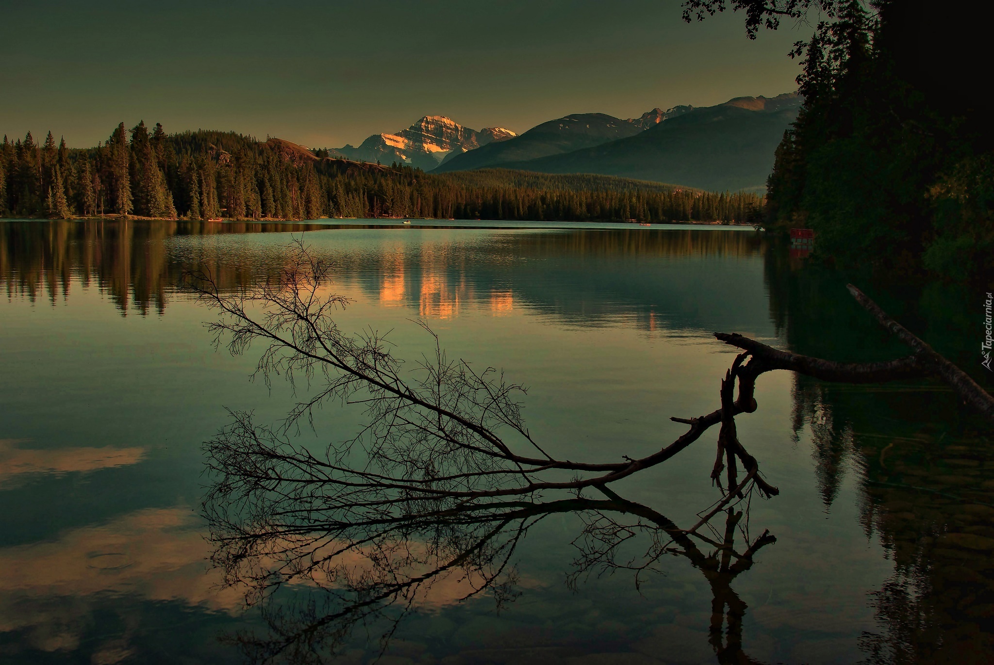 Edytor tapety: Jezioro, Gałąz, Góry, Zachód Słońca, Zmierzch