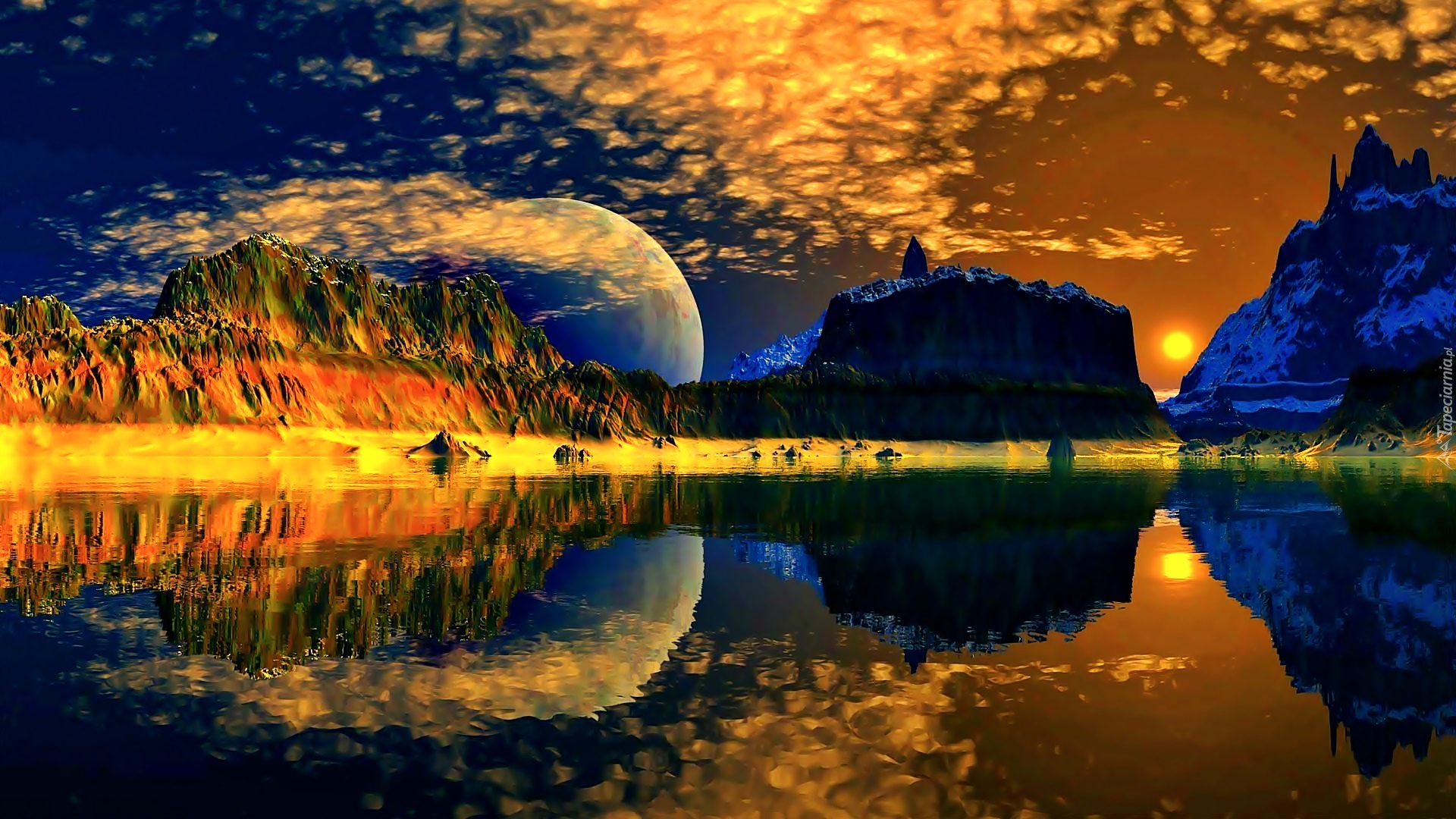Edytor tapety: Góry, Jezioro, Chmury, Zachód Słońca, Księżyc, Odbicie, Fantasy