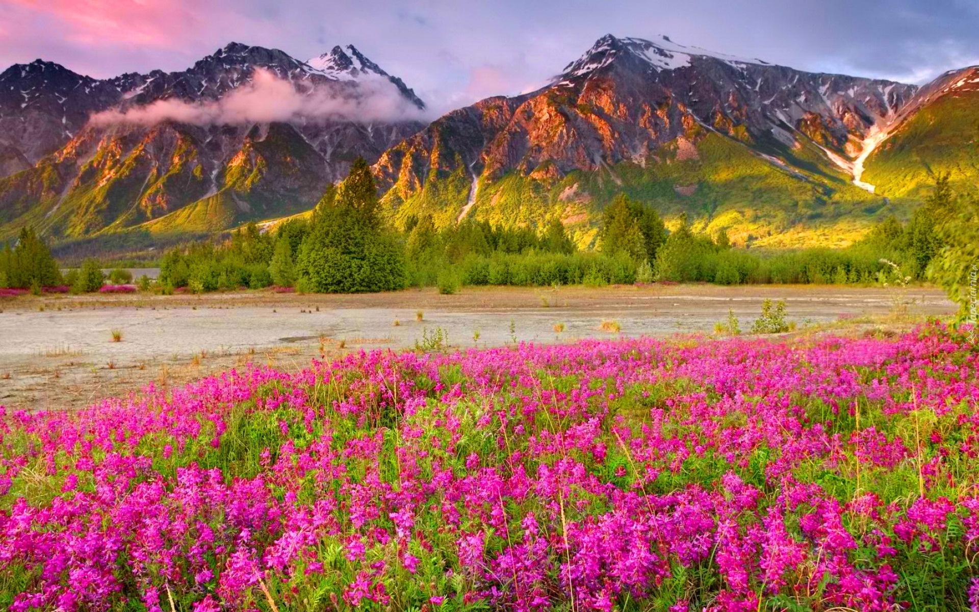 Edytor tapety: Góry, Chmury, Różowe, Kwiaty