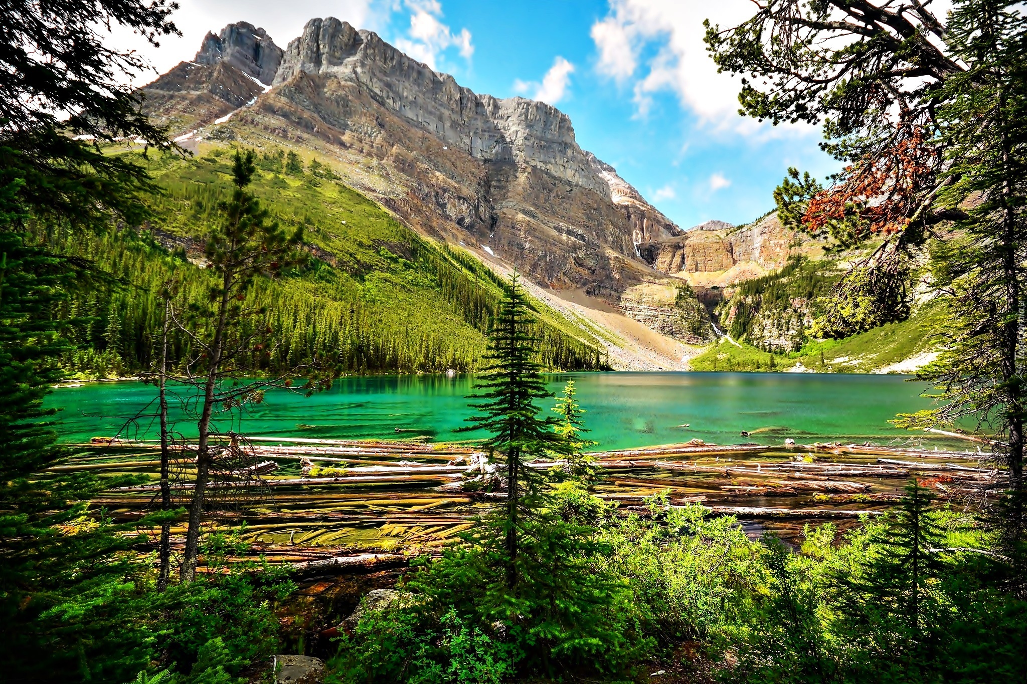 Edytor tapety: Jezioro, Kłody, Góry, Las
