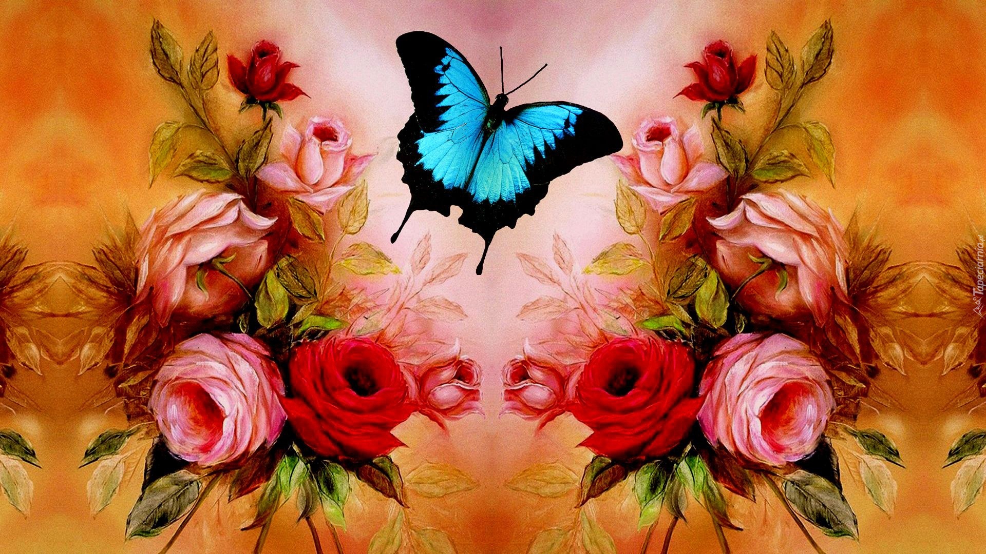 Edytor tapety: Niebieski, Motyl, Rożowe, Czerwone, Róże, Obraz