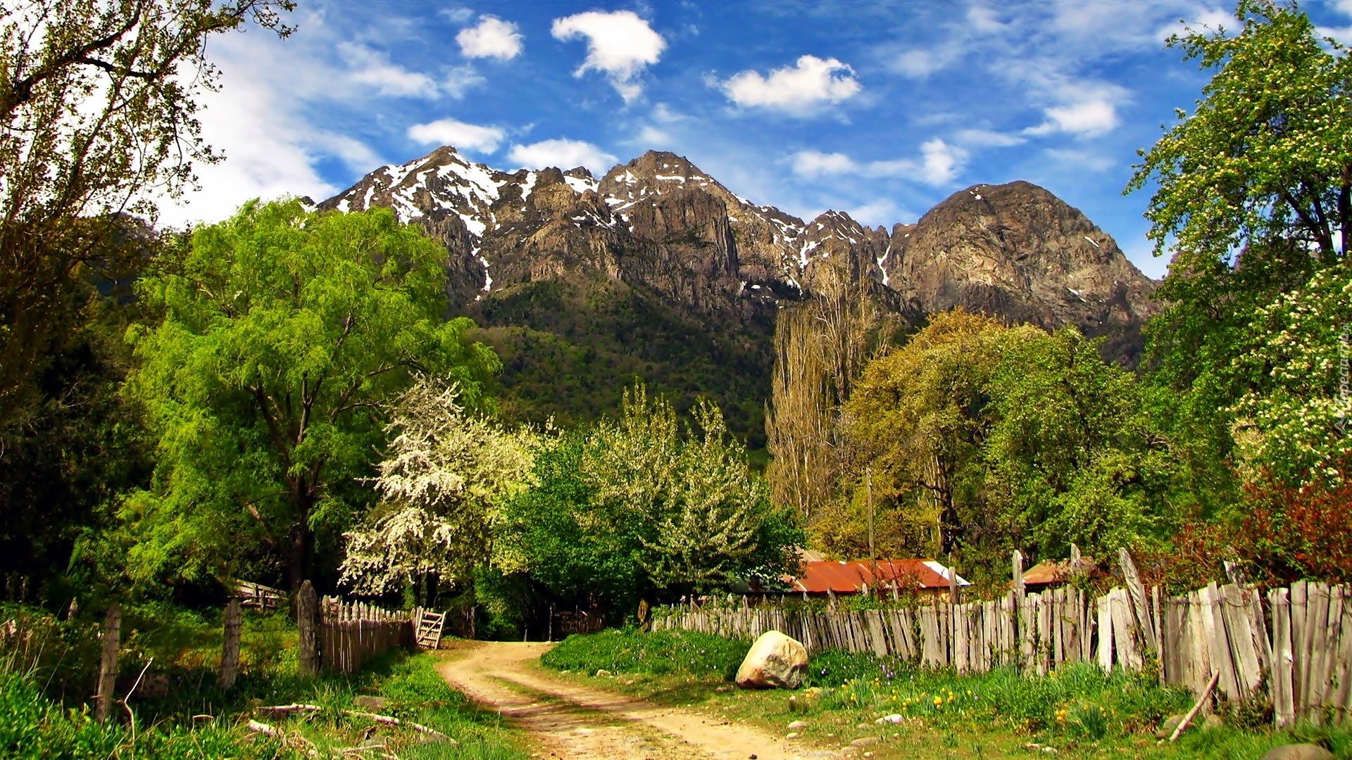 Edytor tapety: Góry, Droga, Drzewa, Wioska