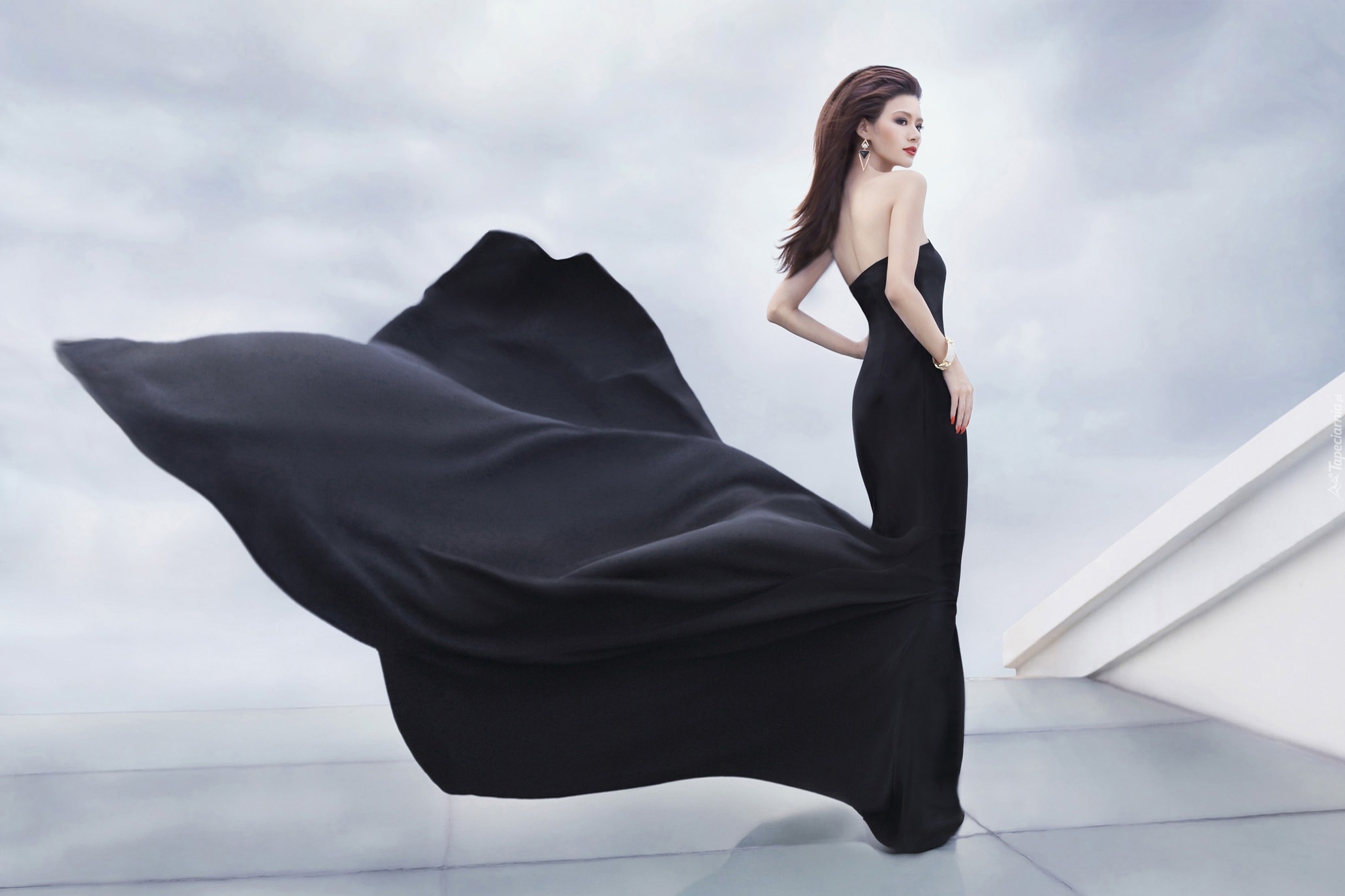 Edytor tapety: Kobieta, Modelka, Brunetka, Biżuteria, Czarna Sukienka, Wiatr