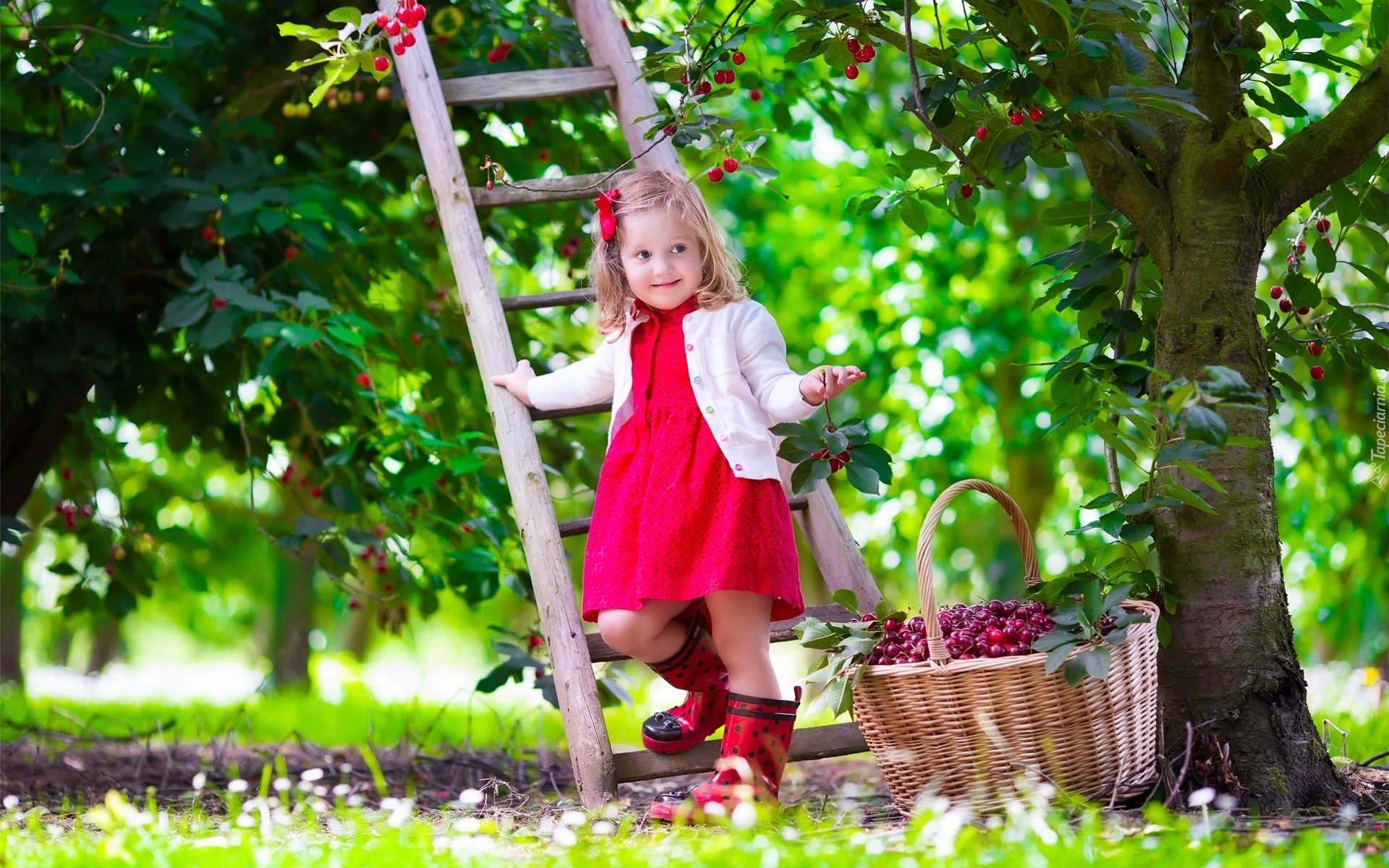 Edytor tapety: Sad, Drzewa, Owocowe, Wiśnie, Koszyk, Dziewczynka, Drabina