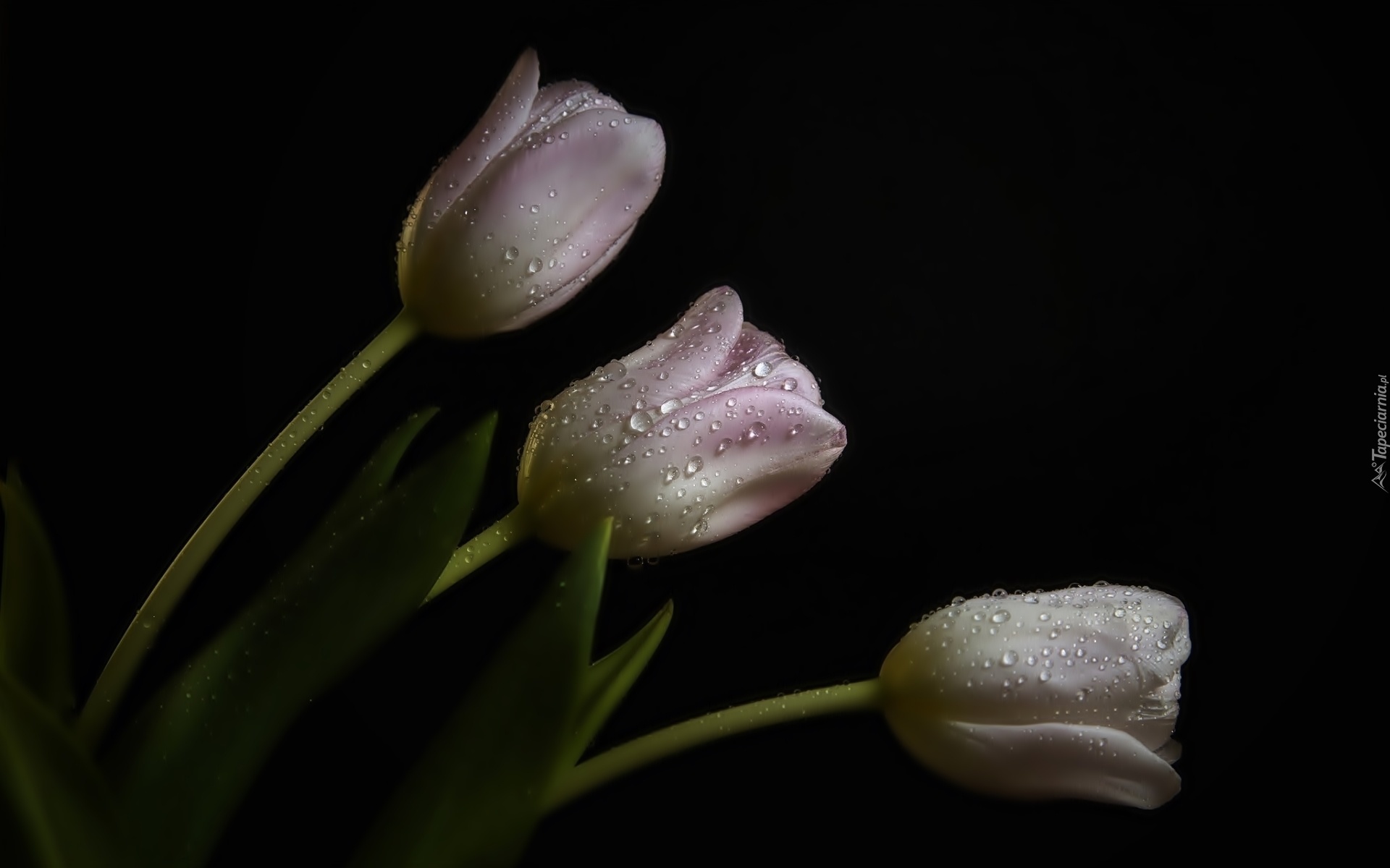 Edytor tapety: Białe, Tulipany, Krople, Deszczu, Czarne, Tło
