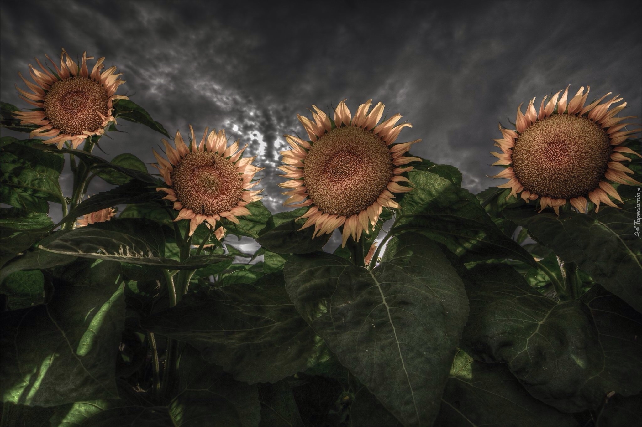 Edytor tapety: Słoneczniki, Liście, Noc, Lato