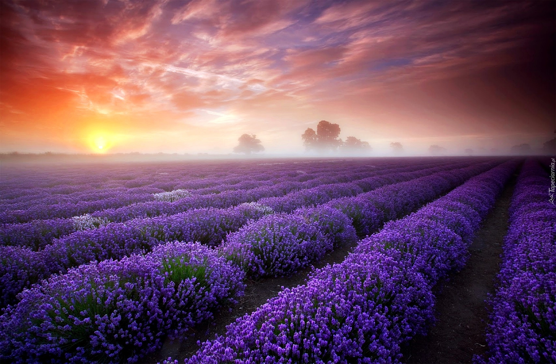 Edytor tapety: Lawendowe, Pole, Mgła, Świt