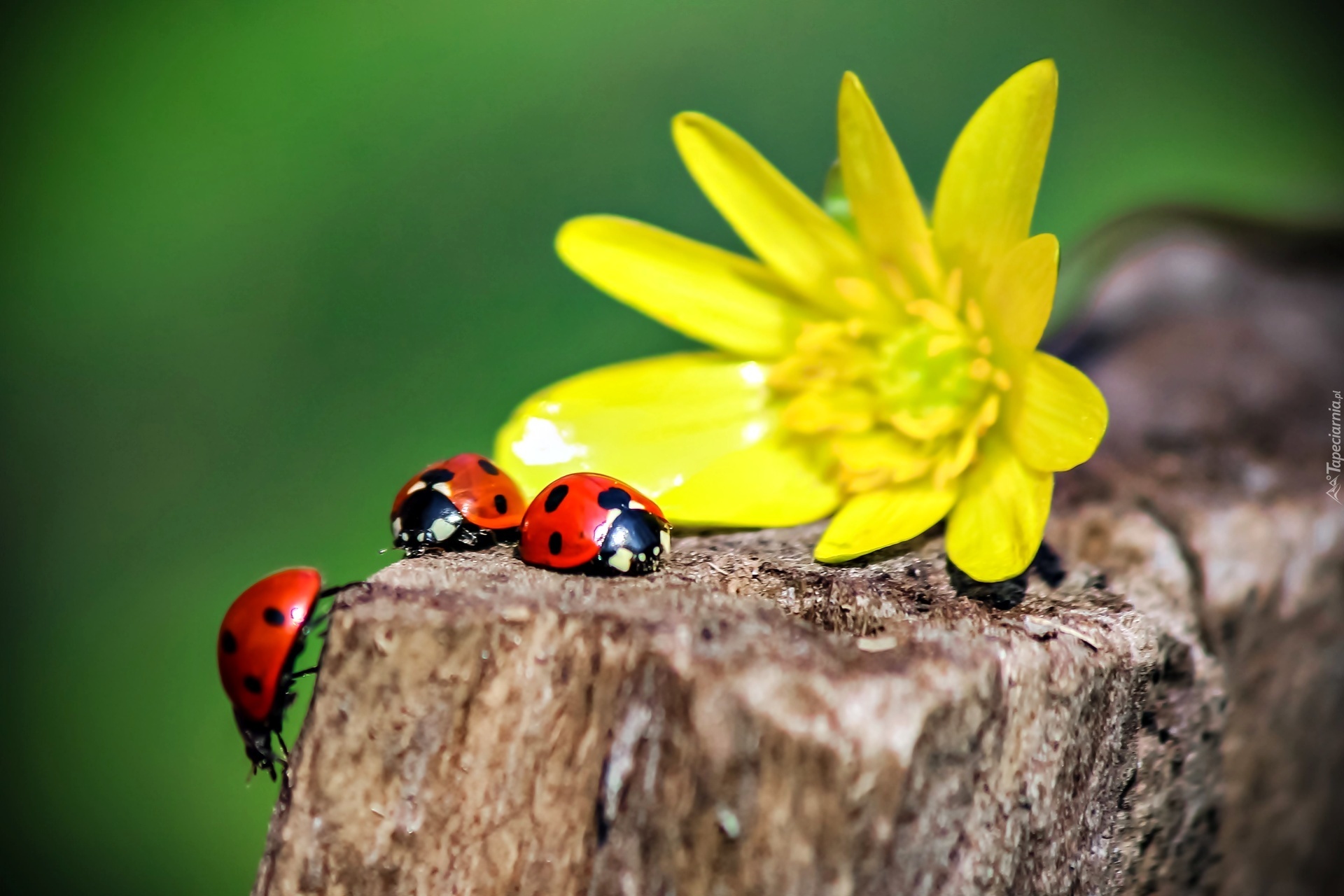 Edytor tapety: Żółty, Kwiatek, Trzy, Biedronki, Pniak