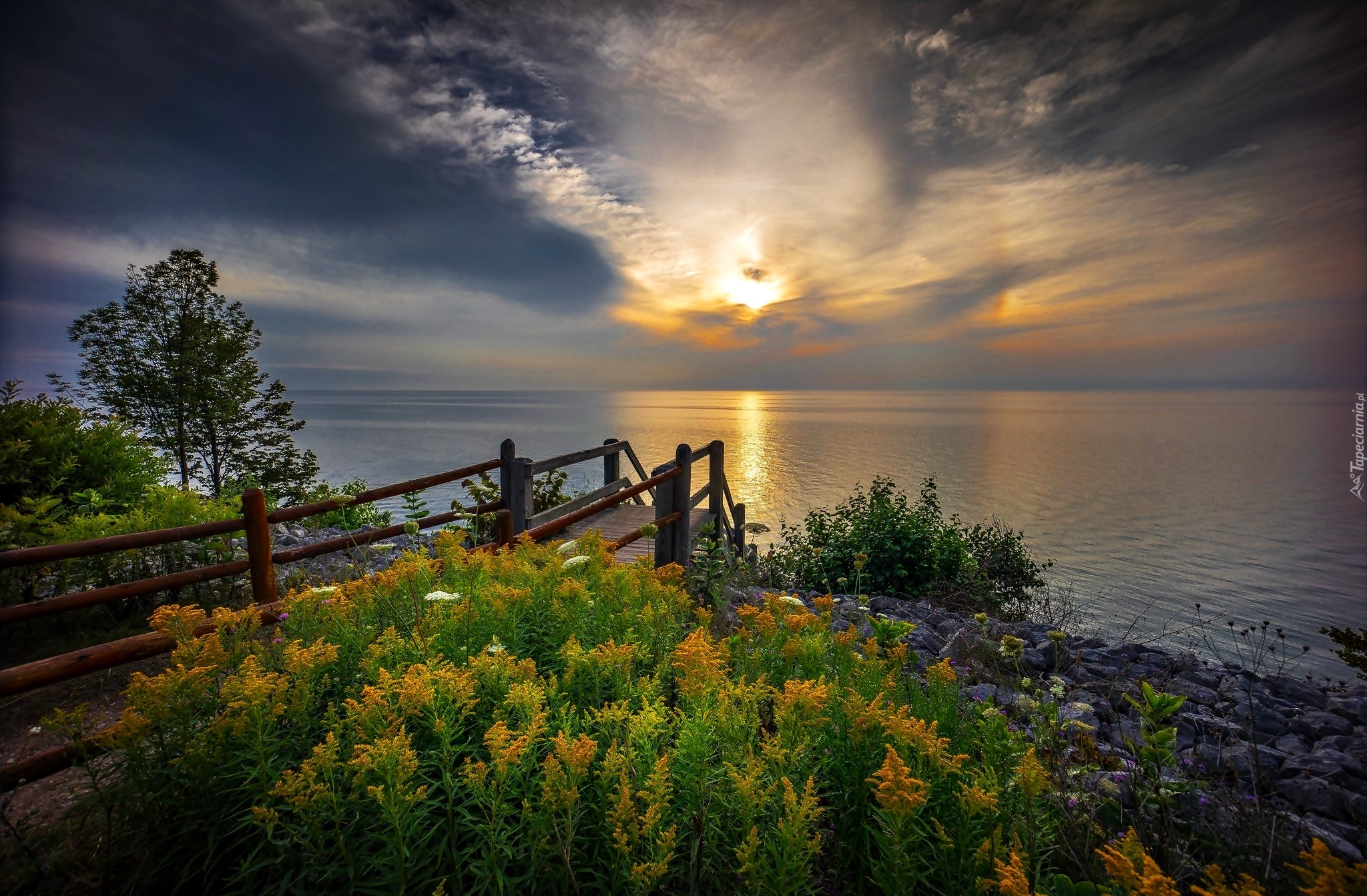Edytor tapety: Morze, Wybrzeże, Zejście, Kwiaty, Wschód Słńca