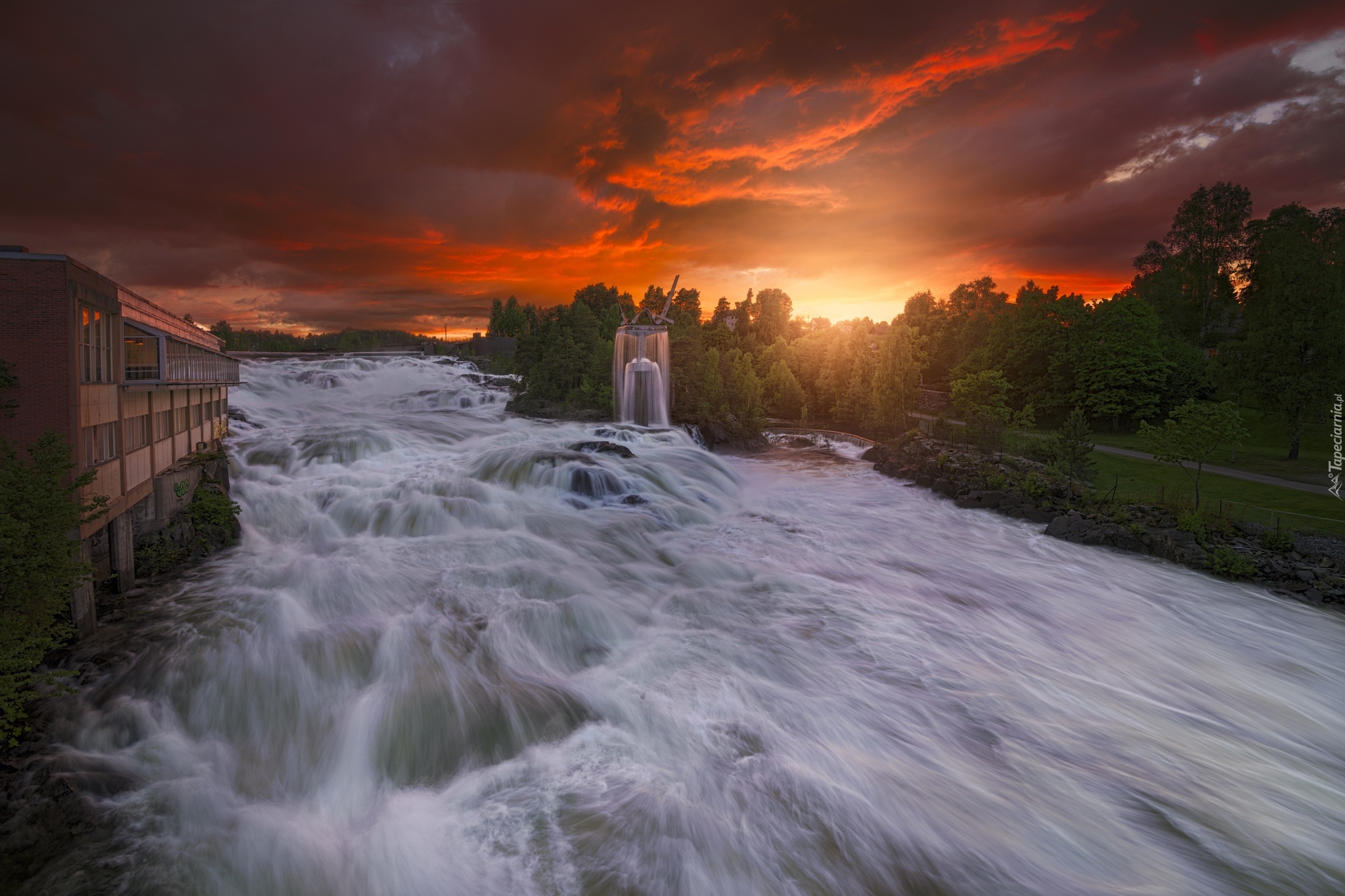 Edytor tapety: Zachód słońca, Las, Wodospad